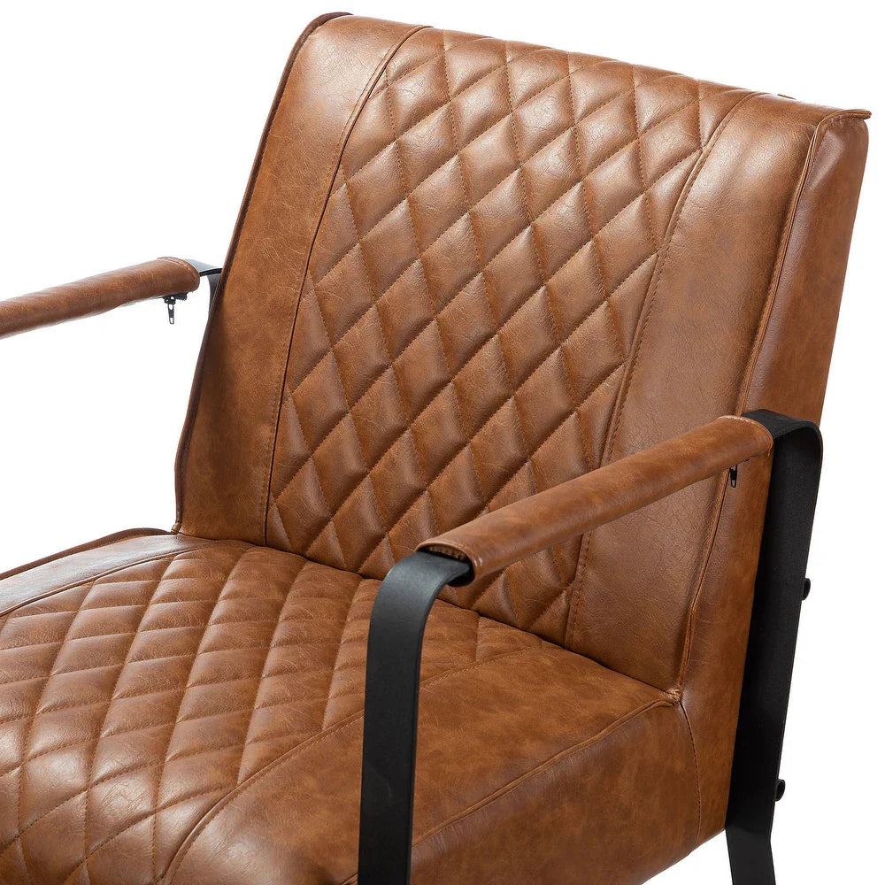 Add sophisticated style and comfort to your home décor with this chair. This handsome tufted accent chair features a leather-like cushioned seat and back for comfort, you can enjoy while you sit back and relax while watching the evening news. Its two armrests are accented with faux leather wrapped for an extra touch of elegant style that is sure to catch the eye of all your guests. Attractive from every angle, this mid-century inspired accent chair is the perfect accent no matter where it stands living room, dining room or office. With its unique color and durable, powder coated black metal frame, this classy chair gives your home décor the wow factor that you have been looking for.