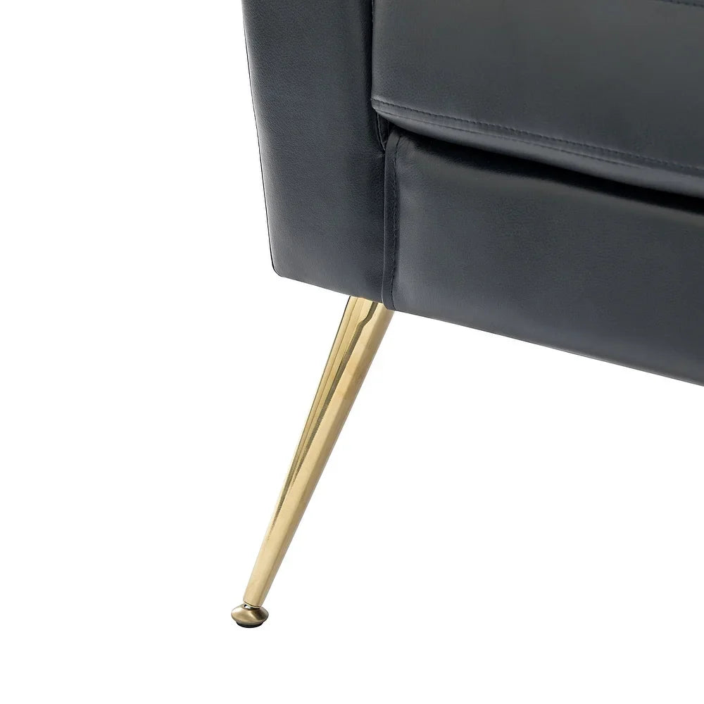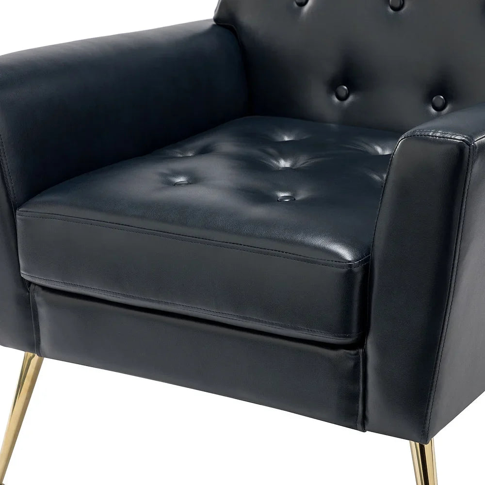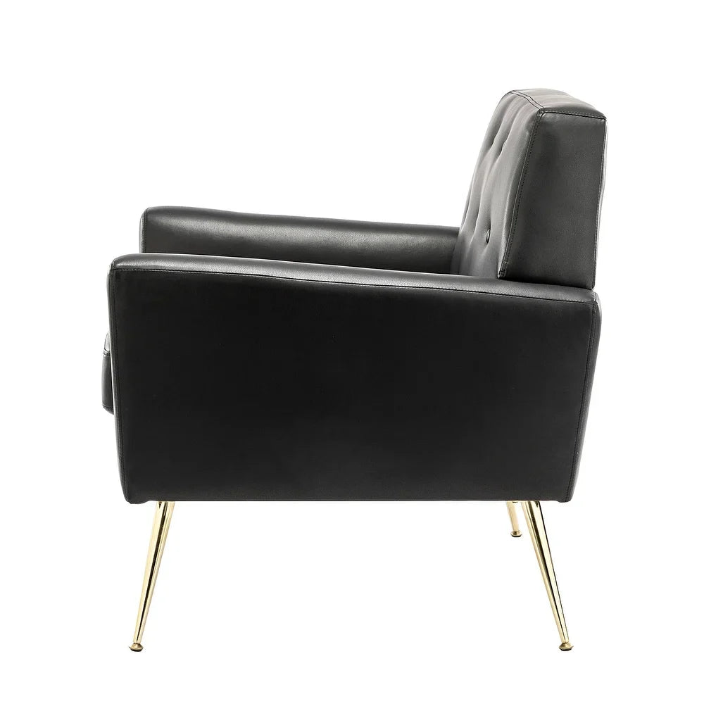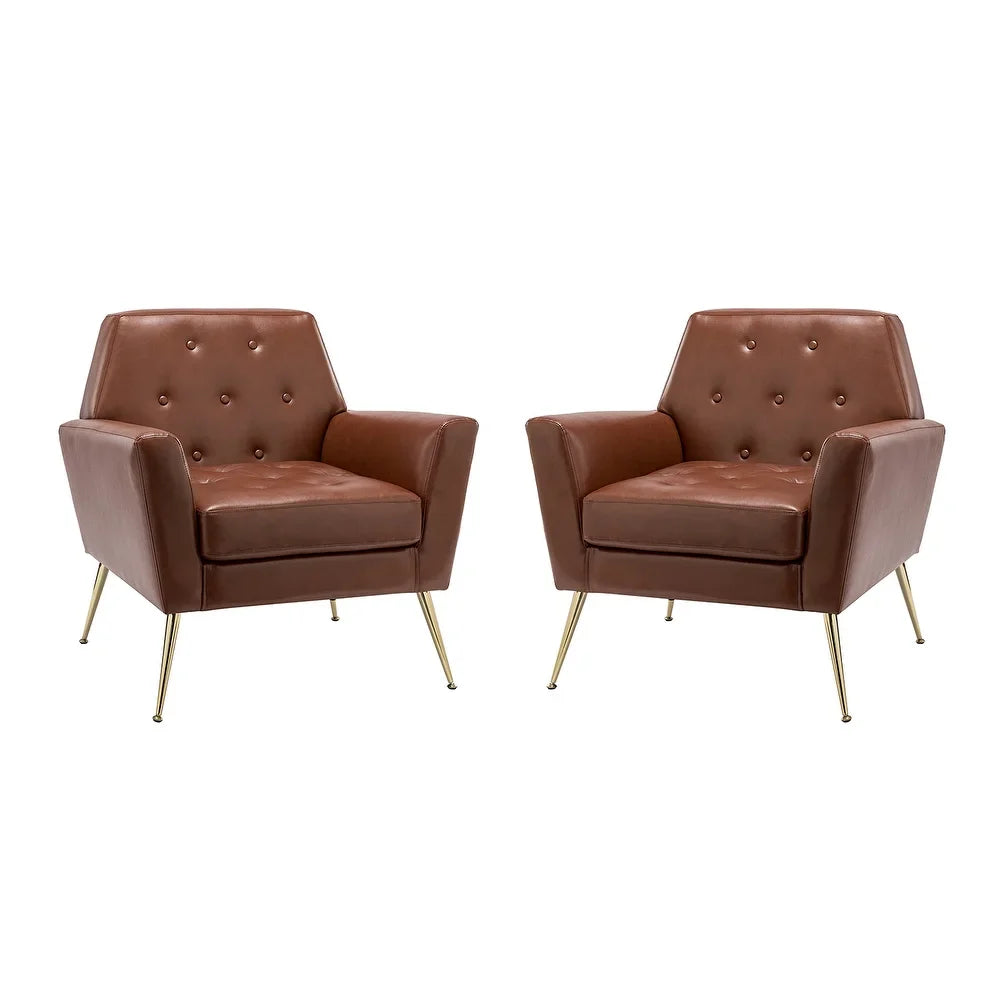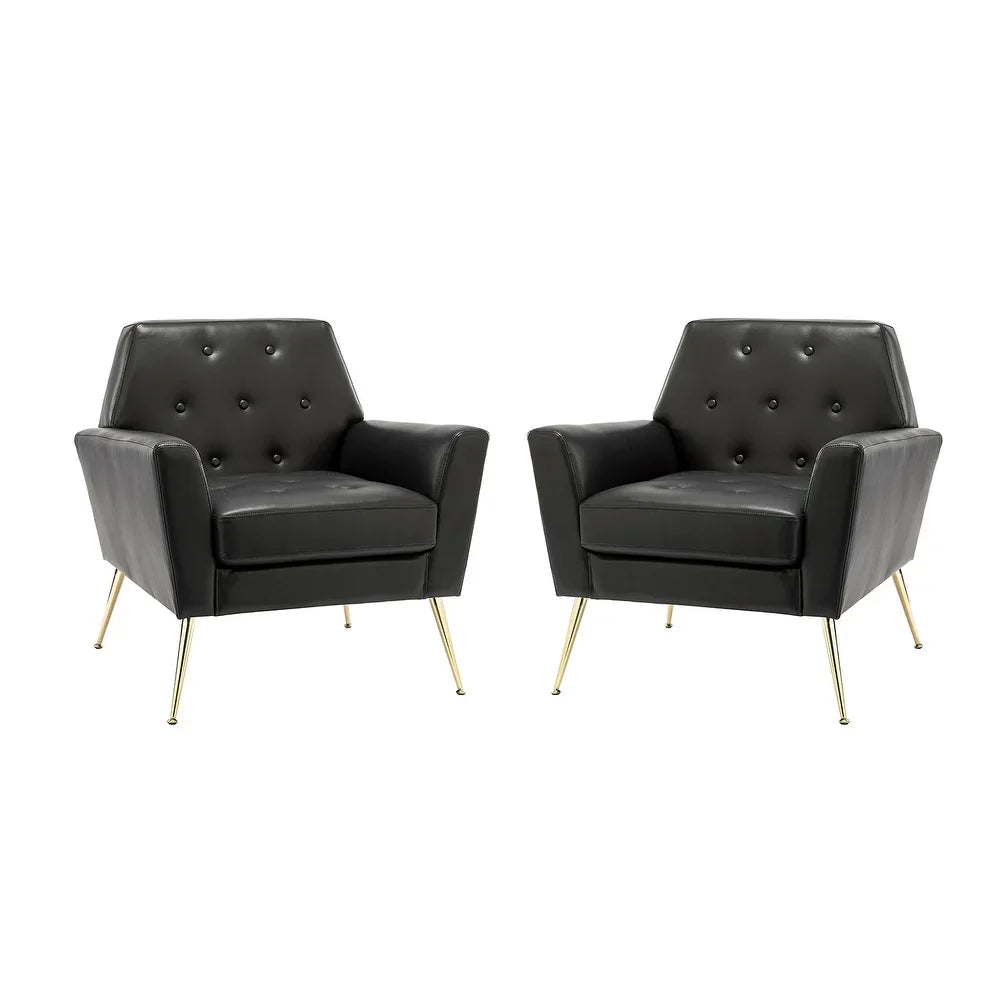Introducing the Mavortius Vintage Design Armchair with Button-tufted Back Set of 2 with Gold Legs - a stylish and comfortable addition to your home decor. These accent chairs feature a unique tufted cushion padded design that offers a luxurious seating experience. Wrapped in skin-touch-friendly vegan leather and perched atop sturdy golden metal legs bonded with a wooden frame, this chair set is both durable and stable. With a contemporary and classic style, these chairs are perfect for any living room, office, or bedroom.