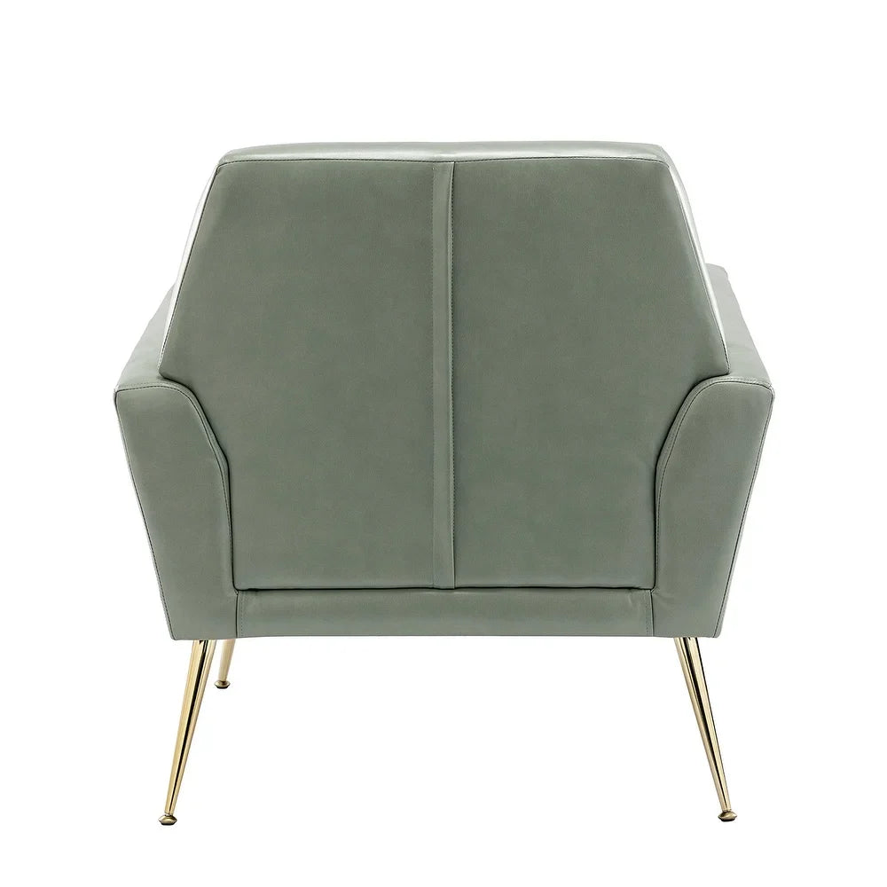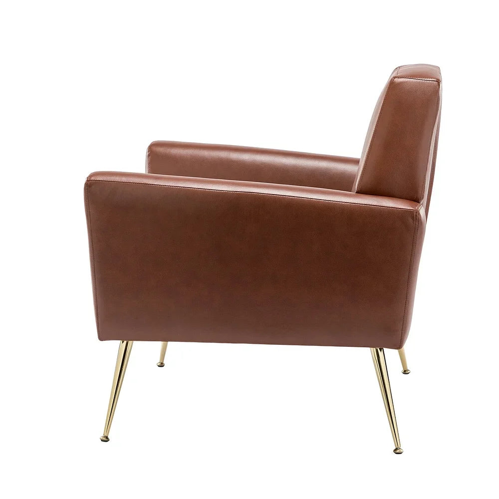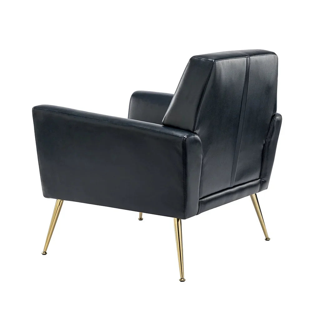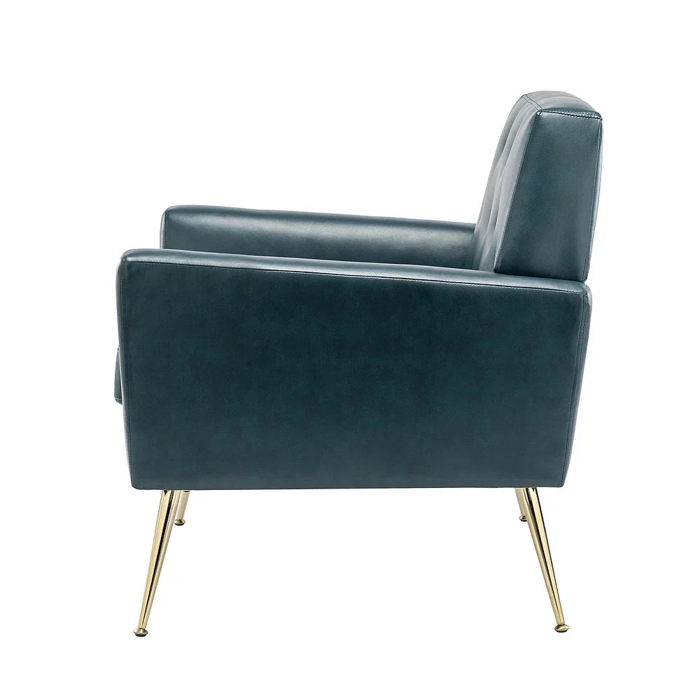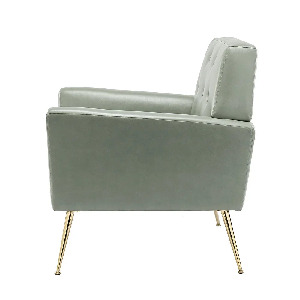 Introducing the Mavortius Vintage Design Armchair with Button-tufted Back Set of 2 with Gold Legs - a stylish and comfortable addition to your home decor. These accent chairs feature a unique tufted cushion padded design that offers a luxurious seating experience. Wrapped in skin-touch-friendly vegan leather and perched atop sturdy golden metal legs bonded with a wooden frame, this chair set is both durable and stable. With a contemporary and classic style, these chairs are perfect for any living room, office, or bedroom.