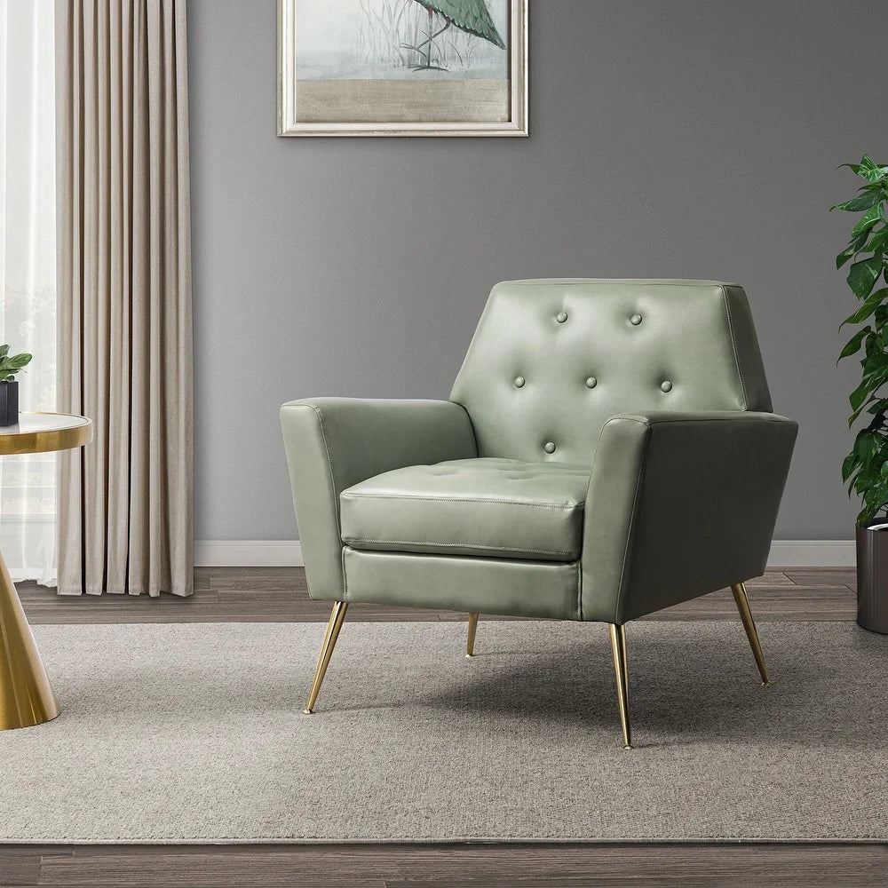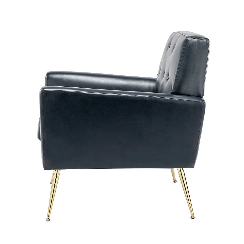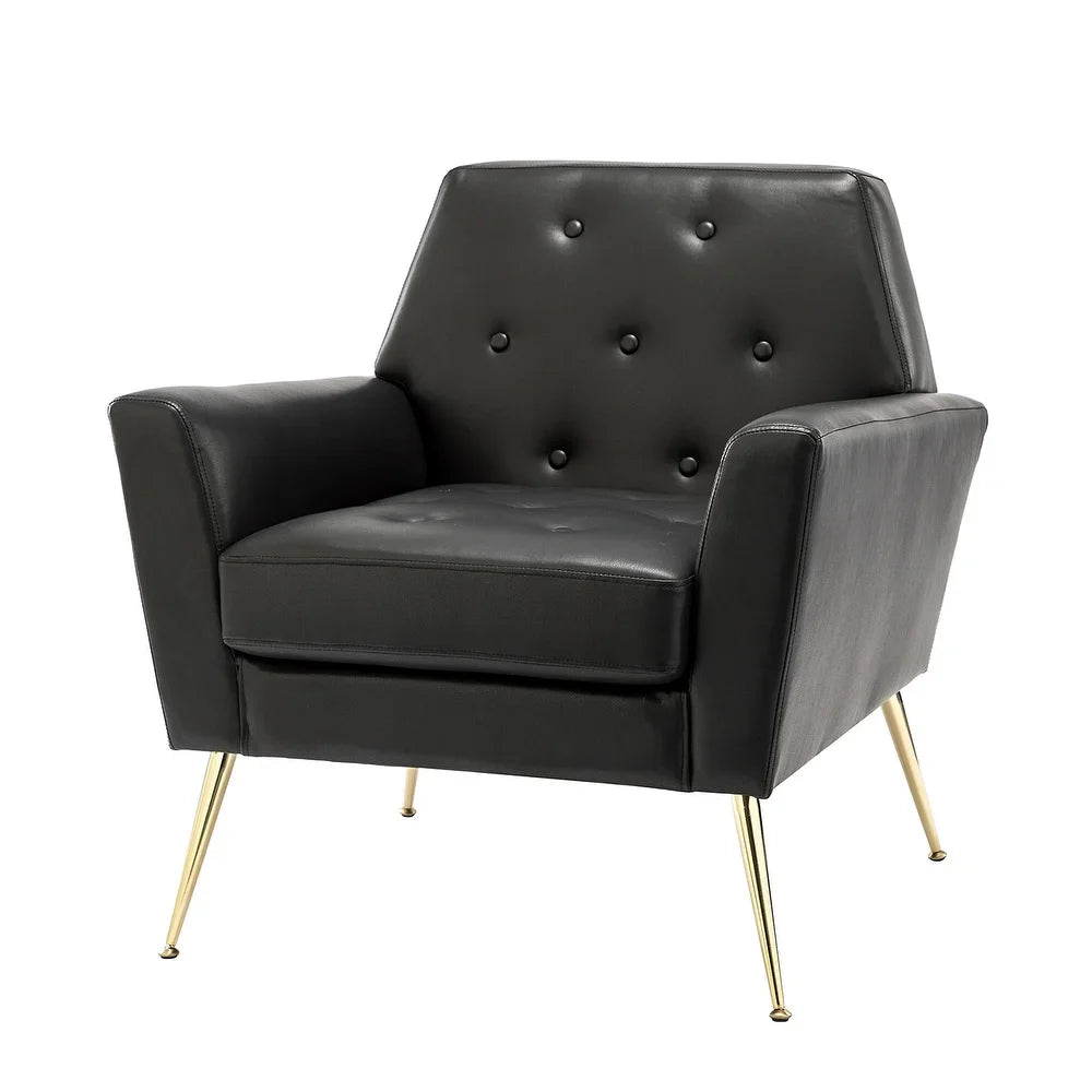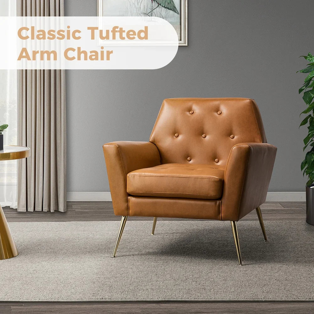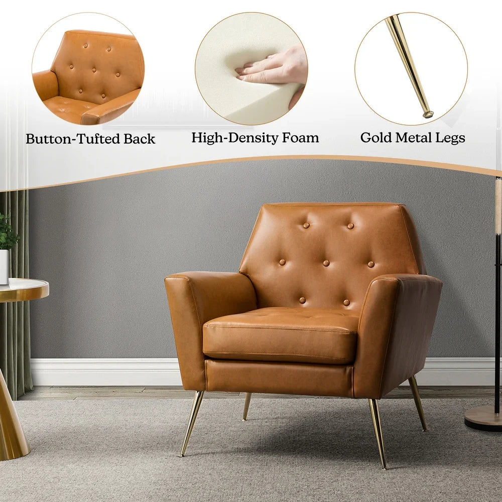 Fall in love with our Mavortius Comfy Accent Armchair, a modern masterpiece that adds a refreshing touch to your home decor. With its unique tufted cushion padded design, you'll experience ultimate comfort and a feeling of floating on clouds. This chic accent chair features a slender golden metal leg design and button-tufted cushions that come in on-trend colors to suit your fashion sensitivities. The cushions are removable for easy cleaning, and the sturdy wooden frame is wrapped in skin-touch-friendly vegan leather for incredible durability. Perfect for the living room, office room, or bedroom, our accent chair showcases an attractive aesthetic that incorporates modern and classic style elements effortlessly.