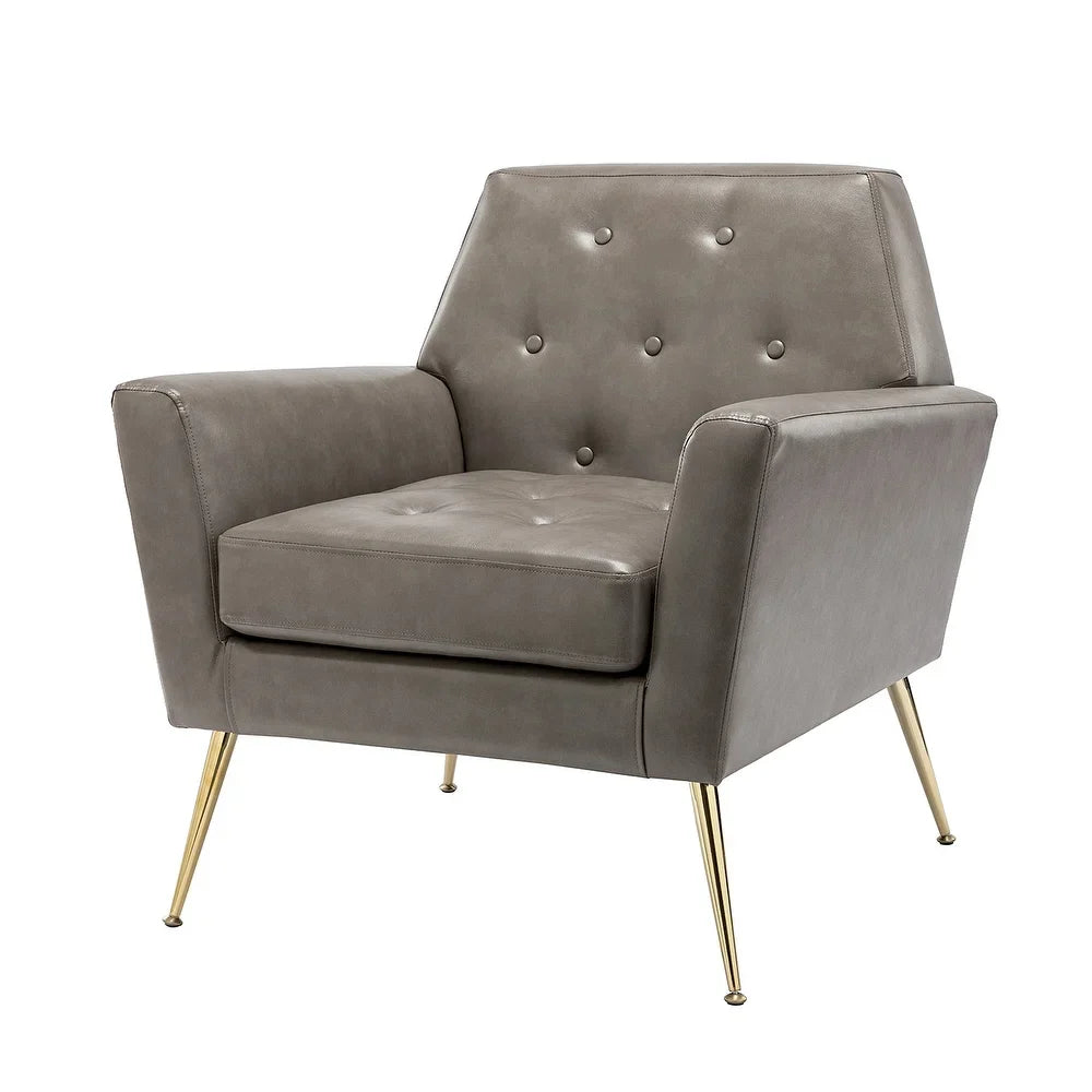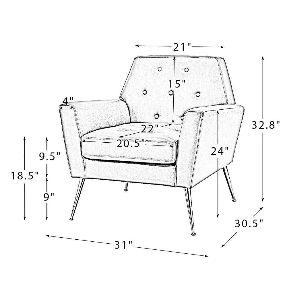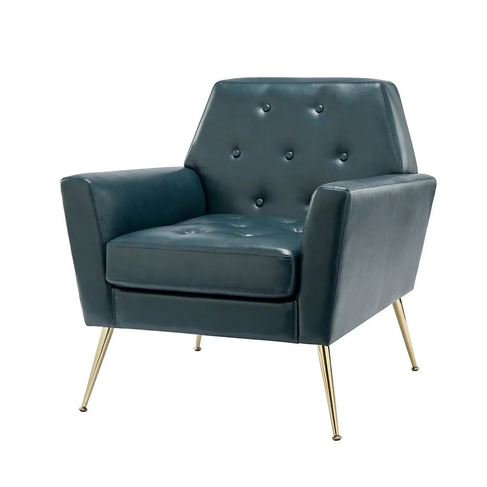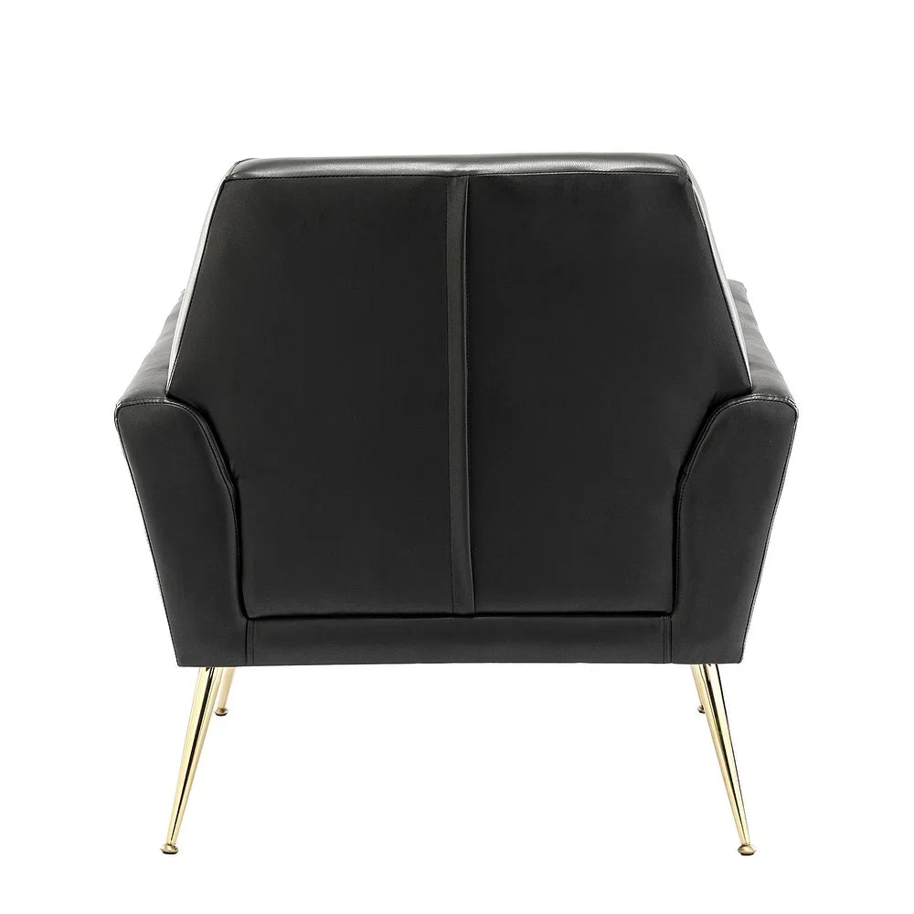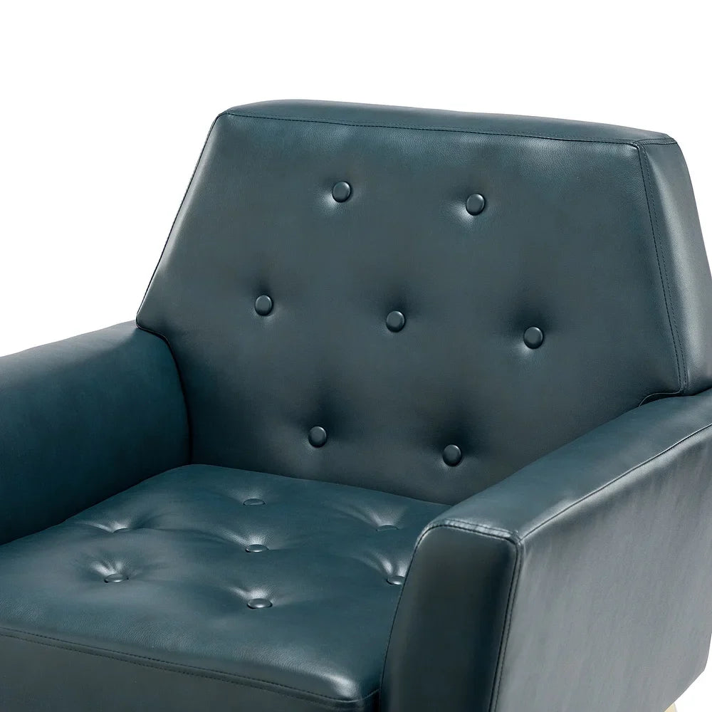 Fall in love with our Mavortius Comfy Accent Armchair, a modern masterpiece that adds a refreshing touch to your home decor. With its unique tufted cushion padded design, you'll experience ultimate comfort and a feeling of floating on clouds. This chic accent chair features a slender golden metal leg design and button-tufted cushions that come in on-trend colors to suit your fashion sensitivities. The cushions are removable for easy cleaning, and the sturdy wooden frame is wrapped in skin-touch-friendly vegan leather for incredible durability. Perfect for the living room, office room, or bedroom, our accent chair showcases an attractive aesthetic that incorporates modern and classic style elements effortlessly.