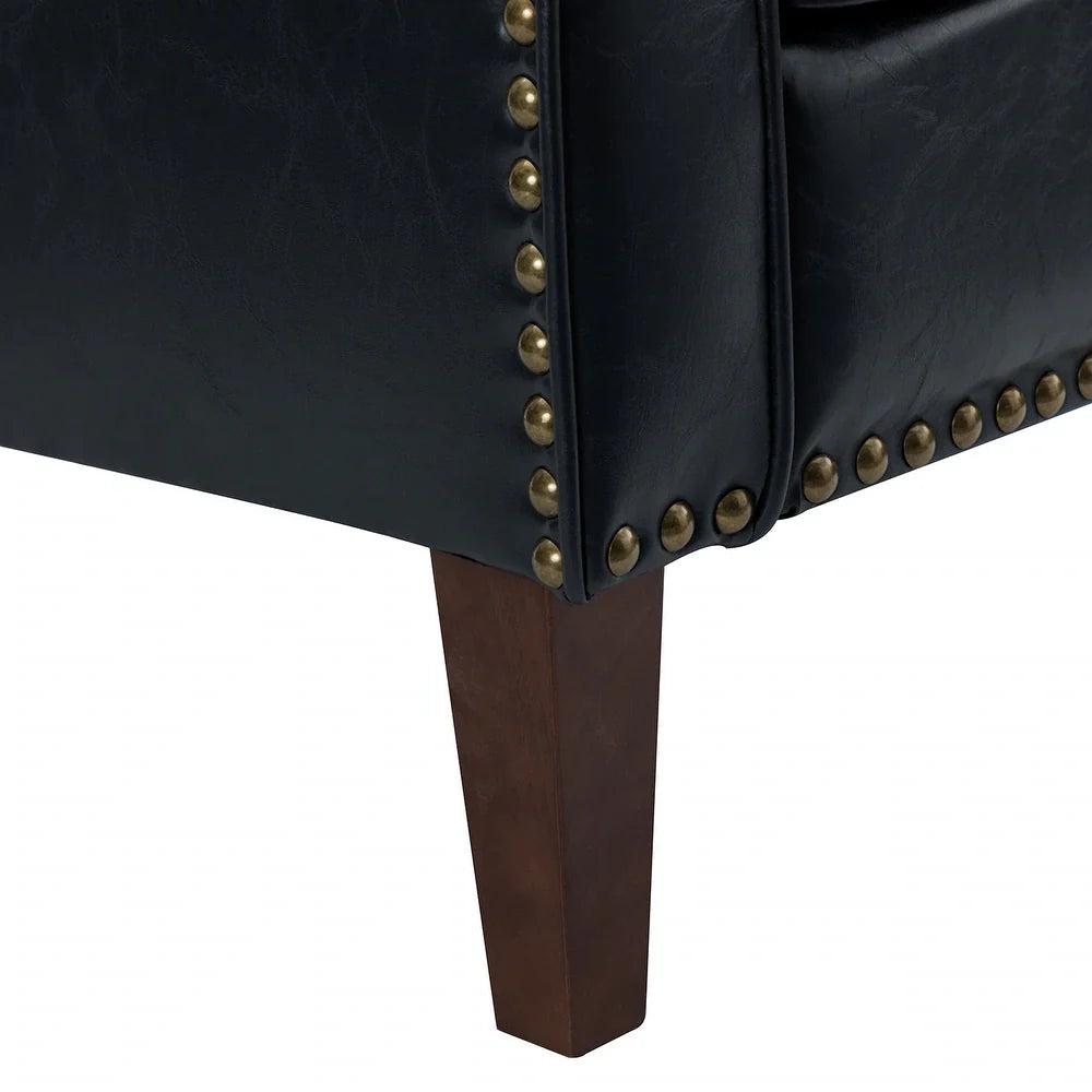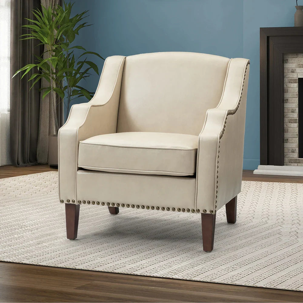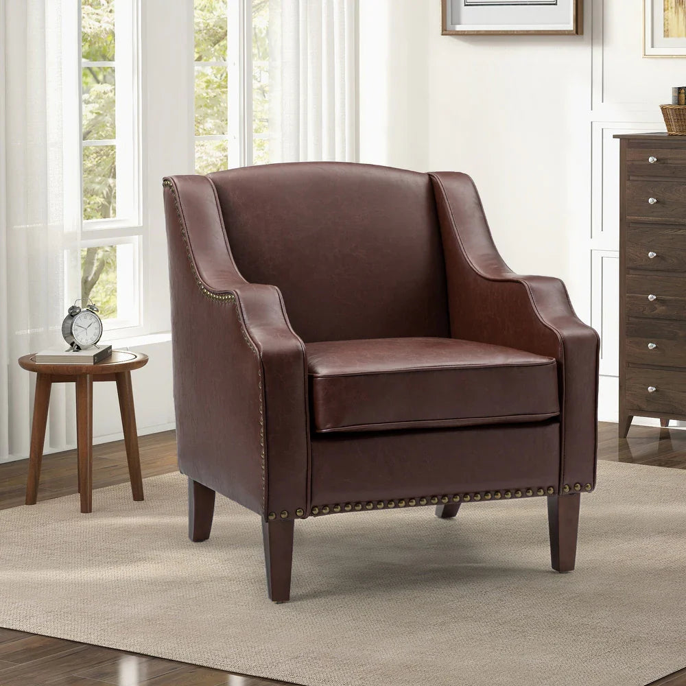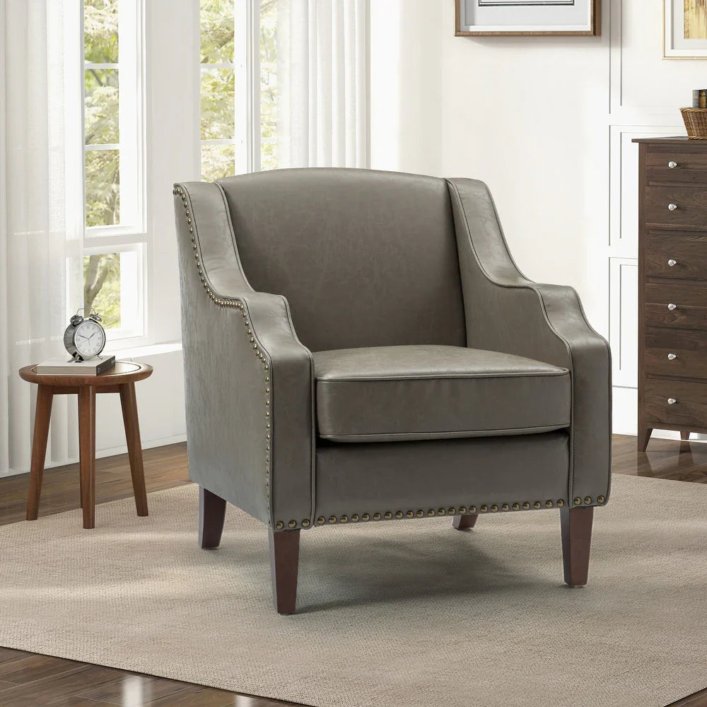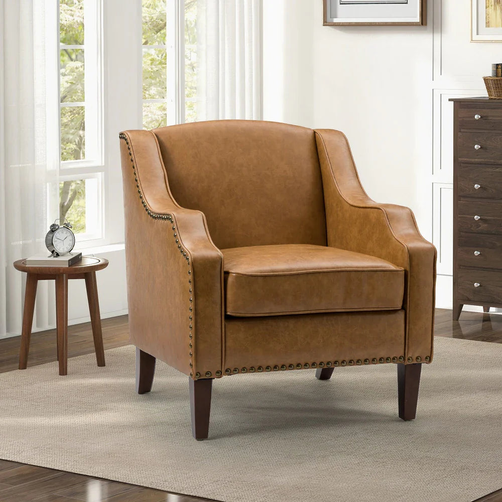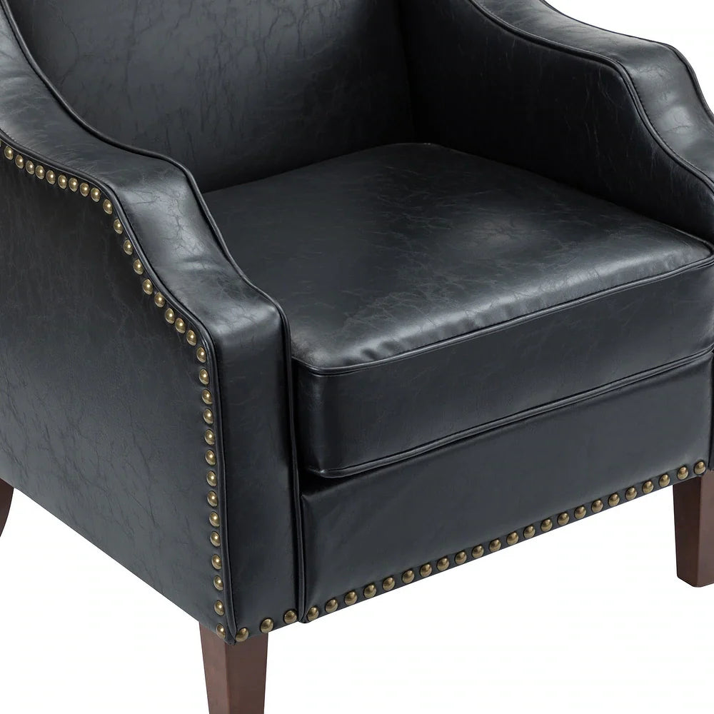 This upholstered chair brings an inviting seat and curated accent to your space. It's built with a sturdy manufactured wood frame and features solid wood legs and special arms for a classic design. The clean-line wings slope down into the arms and are lined with nailhead trims for a vintage flair. This chair is wrapped in vegan leather and has a foam-filled cushion and built-in S-spring for just the right amount of support. Versatile and elegant, this chair is ideally suited for a variety of decor styles in your living room, lounge room, or home office.