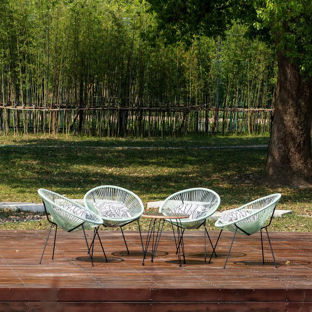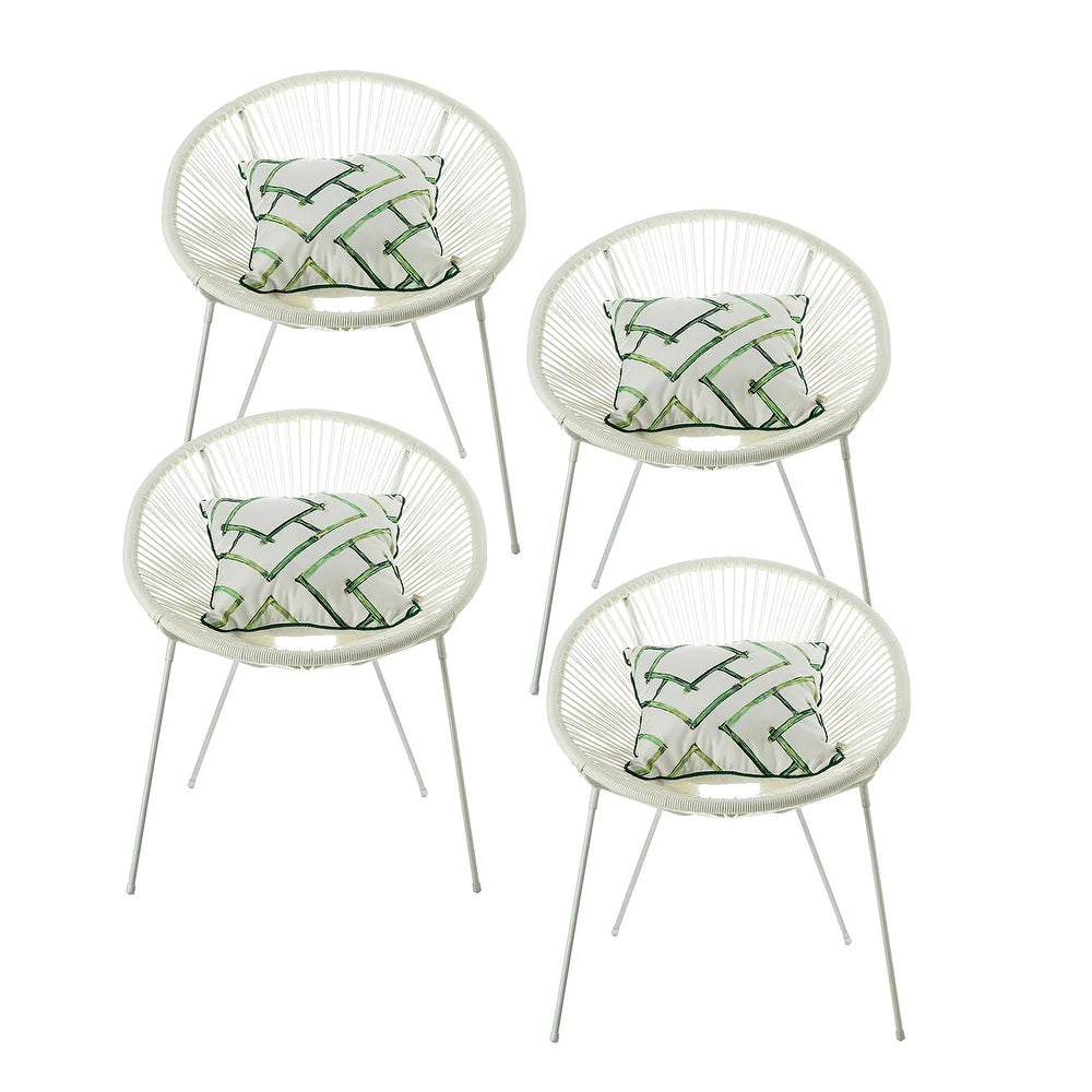 Create a relaxing and stylish outdoor space with this set of four Luvia Outdoor Woven Patio Chairs with Pillow. These hand-woven papasan chairs, available in your choice of solid hue, are perfect for indoor or outdoor patio use. The wicker frame creates a hammock-like seat that's both breathable and durable. The bucket silhouette of the chair adds visual appeal and the slim flared metal legs complement modern decor. Each chair comes with a toss pillow for added comfort. Assembly is easy and simple.