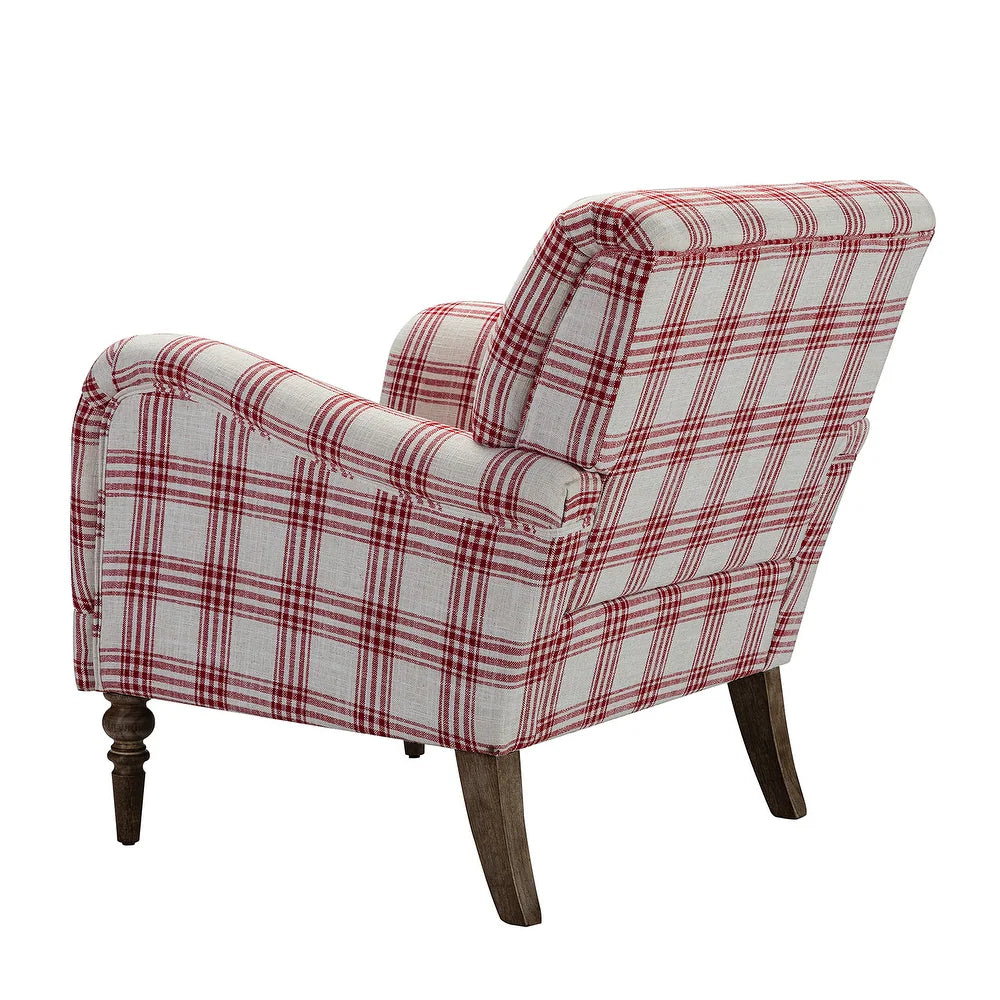 Add a touch of glam to your living room or bedroom with this classic and contemporary style upholstered armchair. Its premium fabric with tartan plaid pattern adds both textural and visual appeal. This armchair is not only stylish, but also comfortable due to its high-density foam filling and pocket spring-padded seat. The solid and manufactured wood frame and elaborately carved wooden legs ensure durability and stability. Perfect for relaxation, reading, or watching your favorite show, this armchair is suitable for living room, office room, and bedroom.