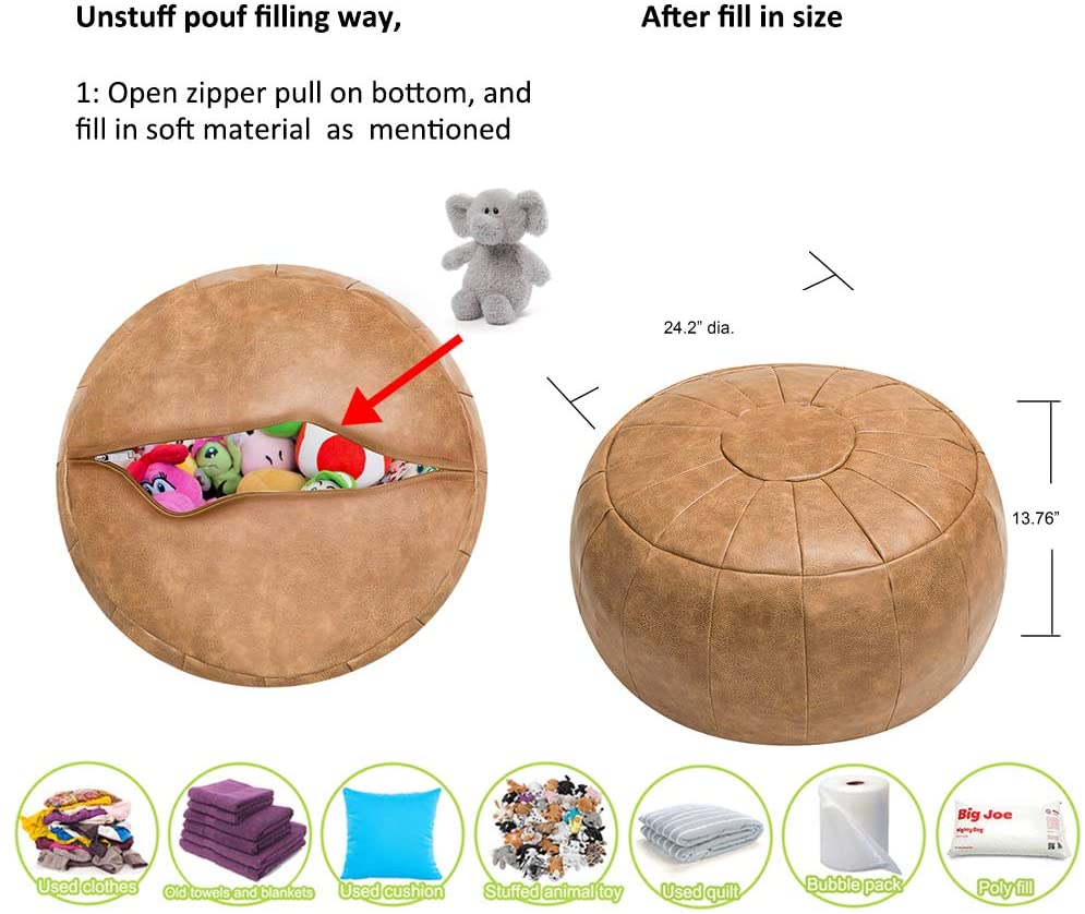 - ECO-FRIENDLY and RECYCLABLE: Rotot pouf uses synthetic leather -- faux leather. Fur free. And it is unstuffed, so you can recycle, reuse, and stuff it with old towels, poly fill, bubble pack, cotton batting, fabric remnants, towels, blankets, used clothes, cushion, pillow, etc. Go Green with the ROTOT.
