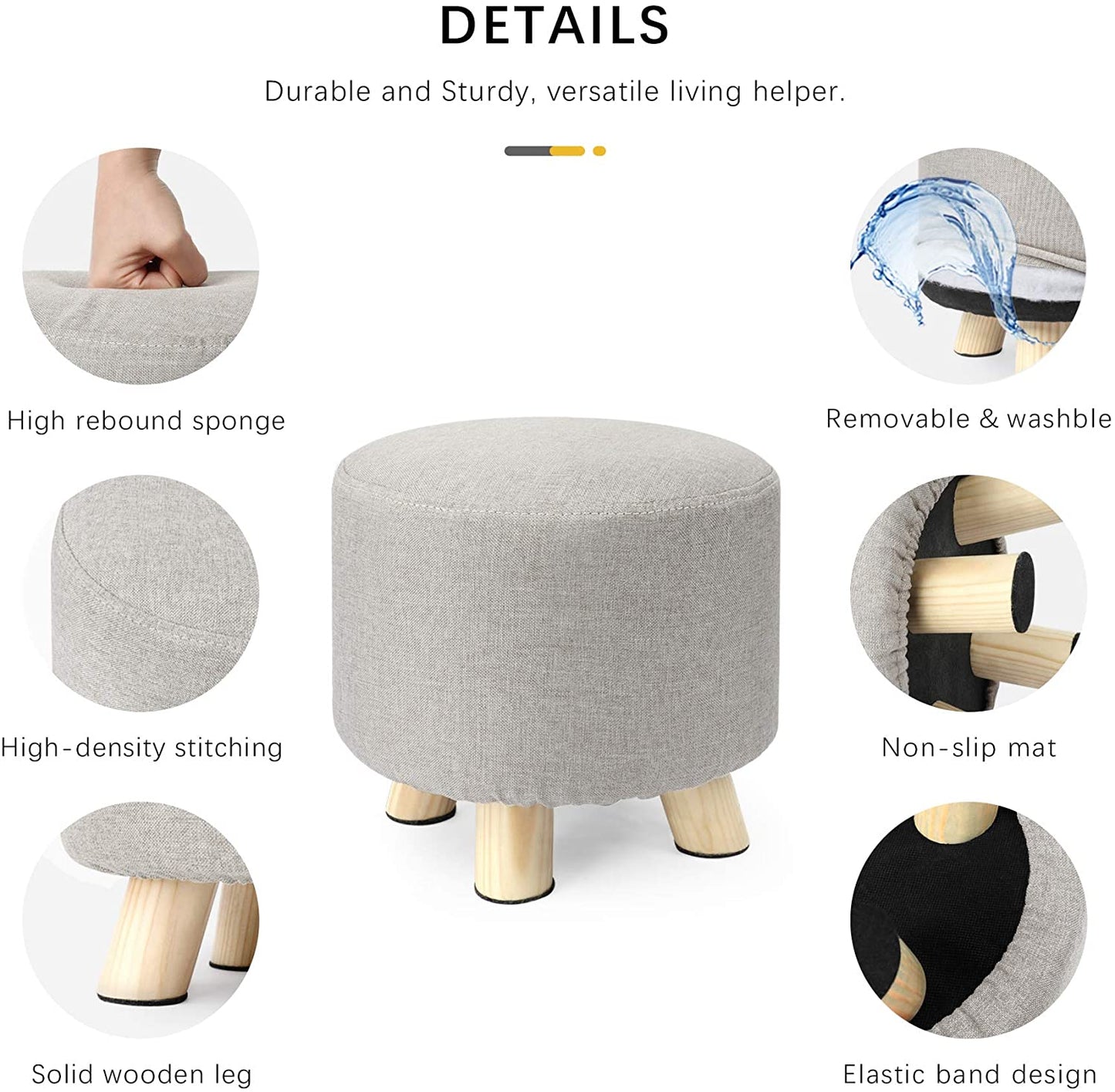 Round Ottoman Foot Rest Stool, Fabric Padded Seat with Non-Skid Wooden Legs and Removable Cover