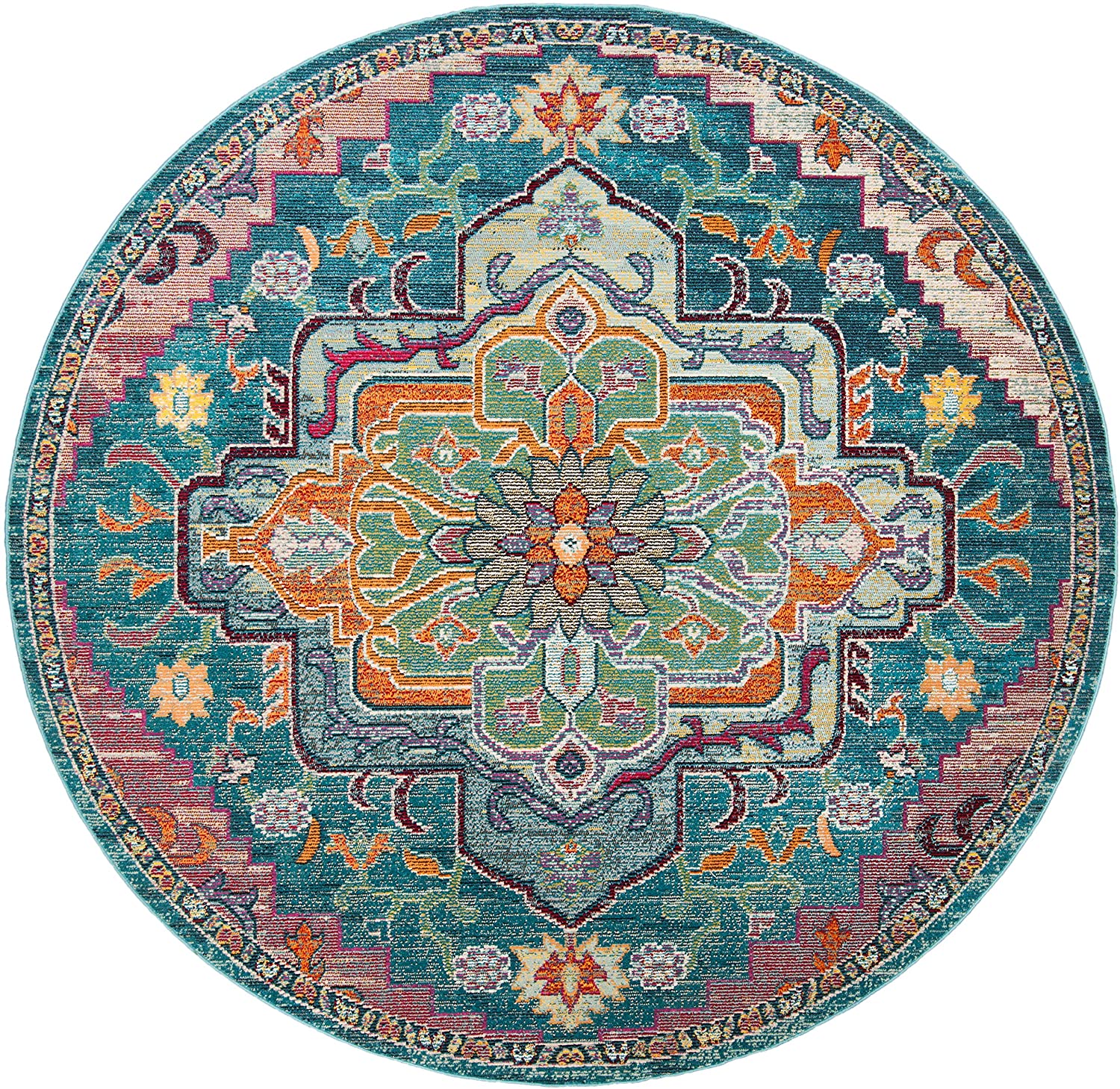 Boho Chic Oriental Medallion Distressed Area Rug, Teal / Rose