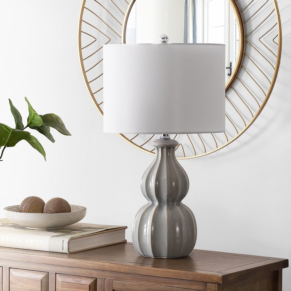 This Wade Table Lamp abounds with decorative depth and visual intrigue, making it ideal for today's contemporary décor. The scalloped double gourde silhouette is absolutely eye-catching, while a soft grey finish ensures Wade perfectly accents any room's color scheme.