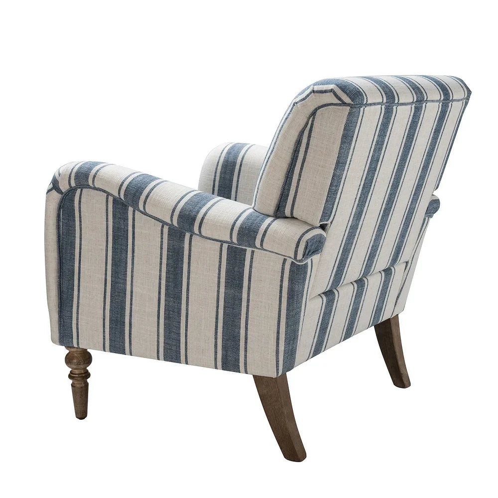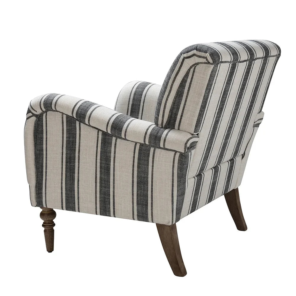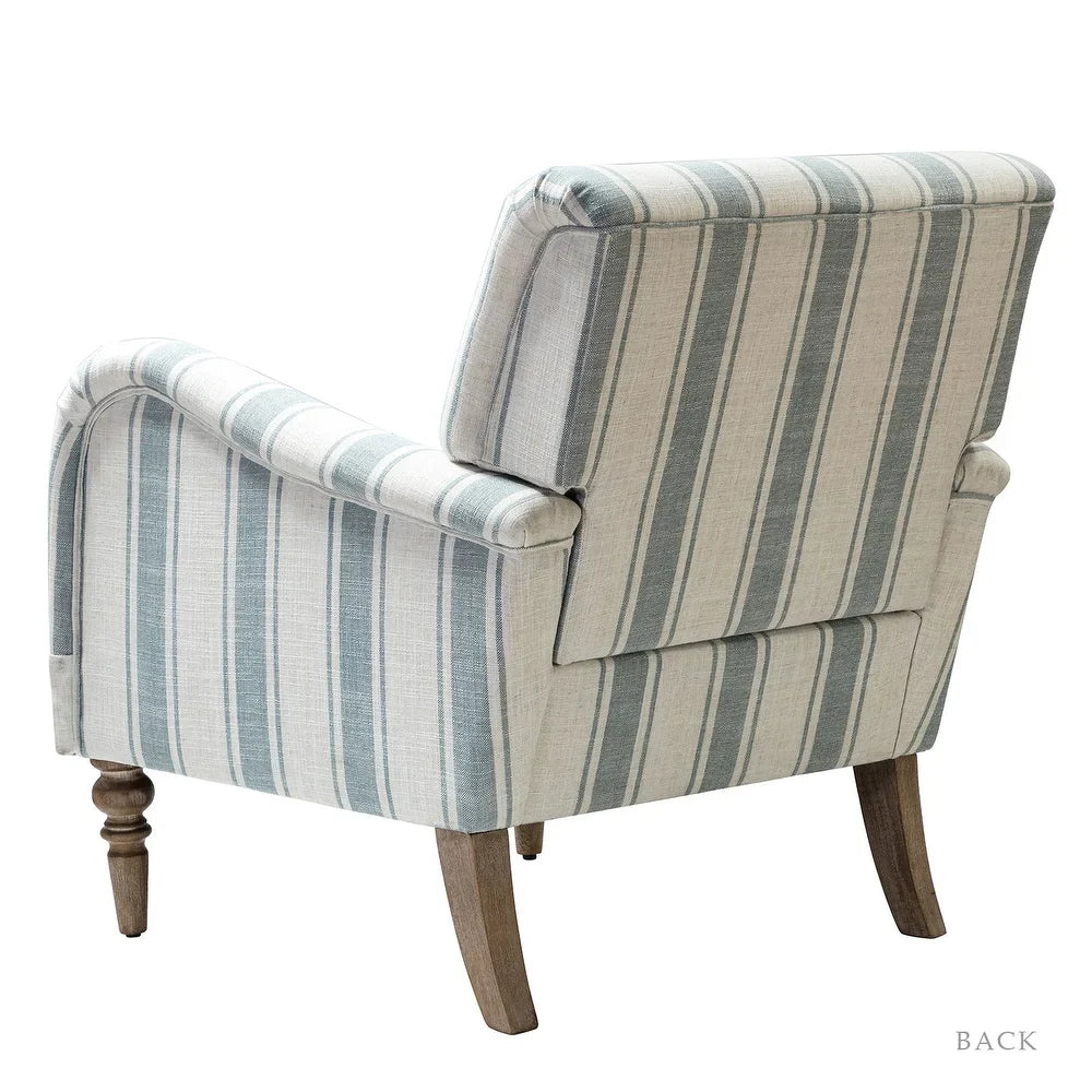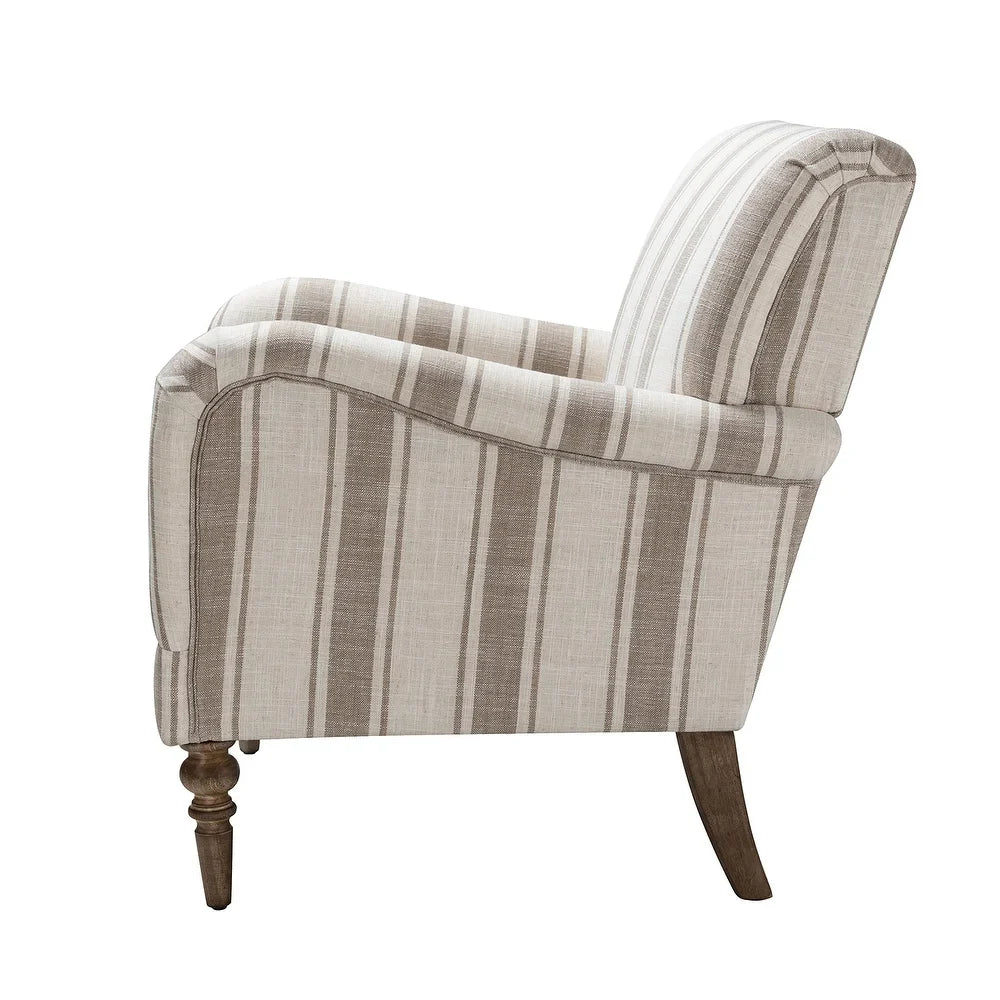 Introduce a touch of glamour to your living room or bedroom with this Iberian upholstered stripe accent armchair. The slightly slanted backrest and integrated arms, along with the retro feet, give this armchair a modern yet classic feel. The premium 100% polyester skin-friendly fabric, on-trend stripe pattern, and high-density foam filling provide both comfort and support. The solid and manufactured wood frame ensures durability, while the retro turning legs and tapered block legs add a timeless appeal to this piece. Perfect for any living room, office, or bedroom.