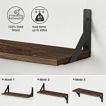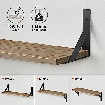 - 【Multiple combinations, More creativity】The classic triangle design of black metal bracket offers two display methods. Install these SAME SIZE shelves with the board on top of the brackets or below to concrete wall provide more decor choices. Hanging them as "a long bookshelf" or "a vertical bookshelf shelving unit" to showcase plants, perfume bottle, candle Jars, family pictures, albums, Knick knacks, stuffed toys, collectibles, picture books, kids books.