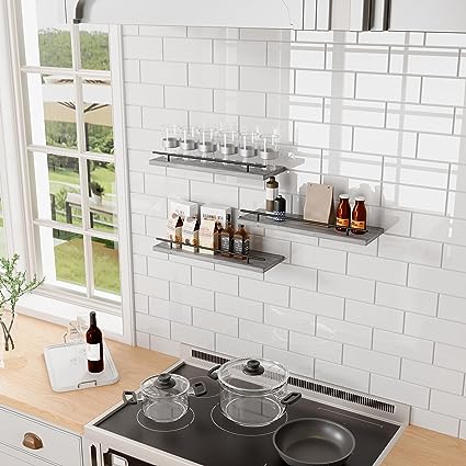 - Practical Detachable Metal Guardrail: Equipped with metal guardrails to prevent items from accidentally falling off the shelves, it is very suitable for use in areas with multiple bottled items such as kitchens and bathrooms. also be used in the living room and bedroom to visit artworks and photo frames to provide support or protection.