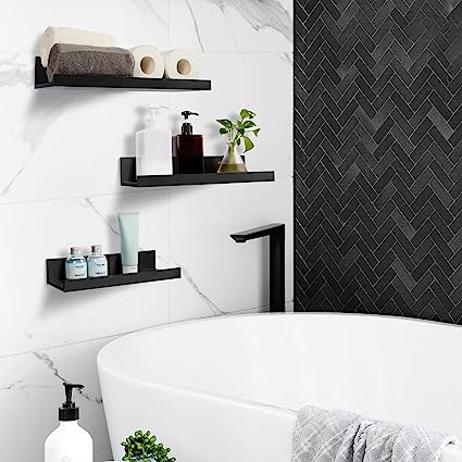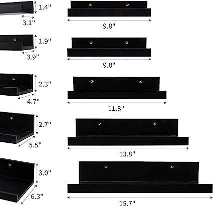 - 【SPACE SAVING】: Our 5 black floating shelves for wall provide different sizes of storage space, allowing you to efficiently utilize space on wall. You can place picture frames, small plants or decorations on a wood shelf to organize your home space. Wall mounted shelves lip will prevent items from falling off.