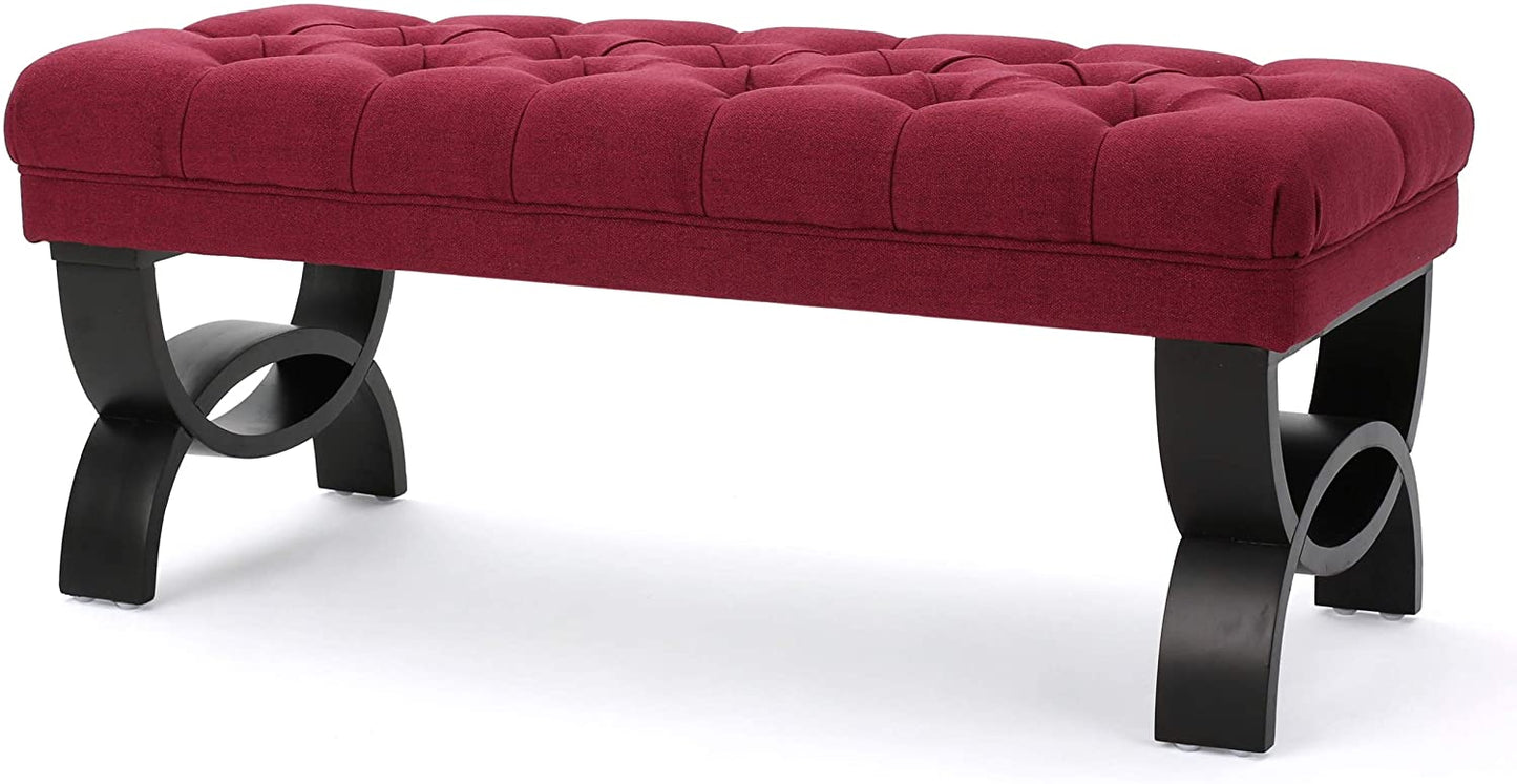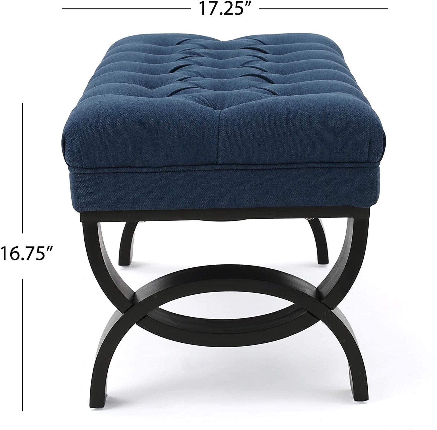 - Enjoy luxury and sophistication with this beautiful ottoman bench. This piece is upholstered in plush tufted fabric and stands on unique crossed espresso stained legs that gives this piece a modern twist. This bench is great for extra seating, as a footstool, or as a coffee table.