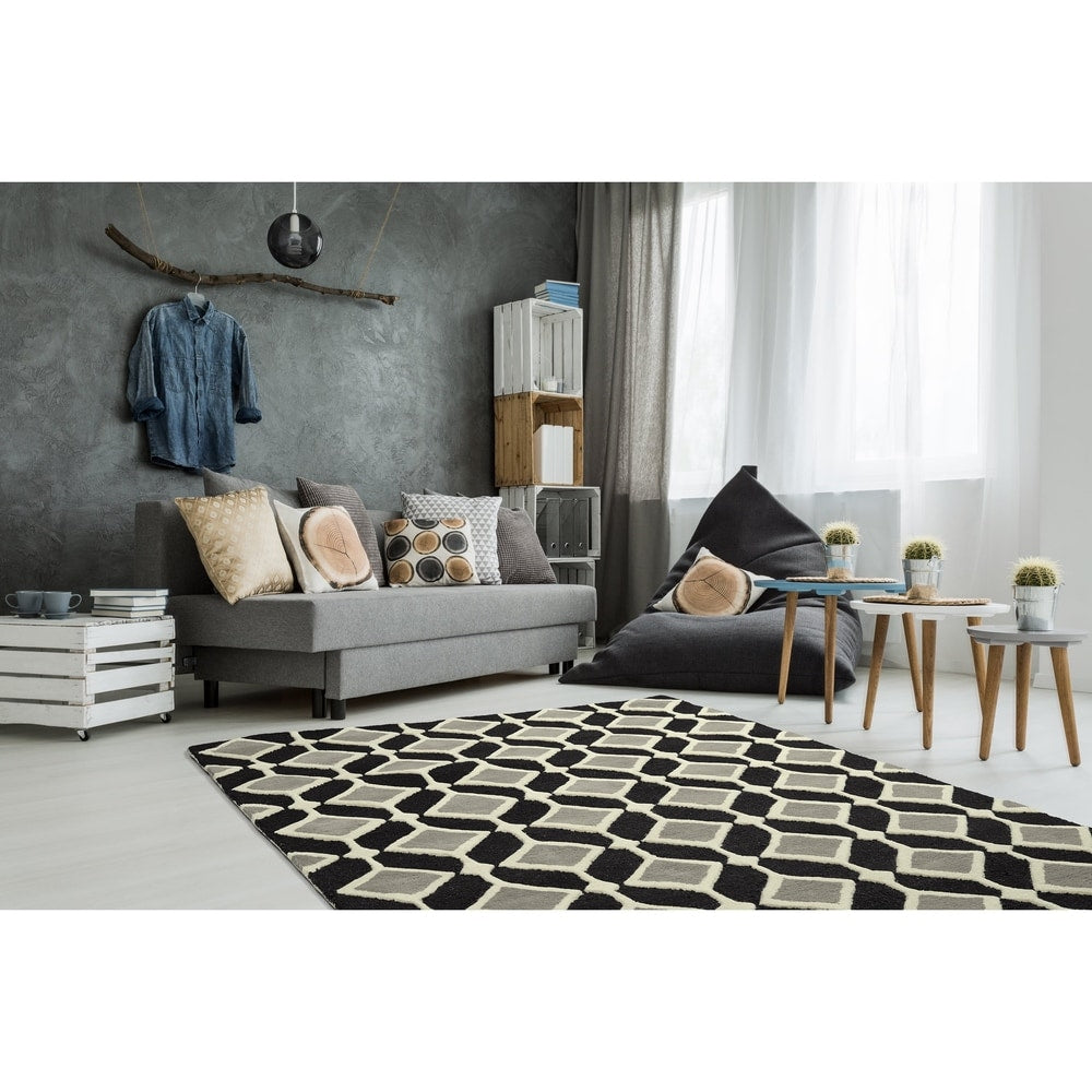 Modern textile design and todays hottest colors combine to meet the new evolution of this beautiful rug. Each rug is handmade and hand-carved in India of 100% Virgin Wool for added detail and texture. Detailed colors: Black,Beige,Grey