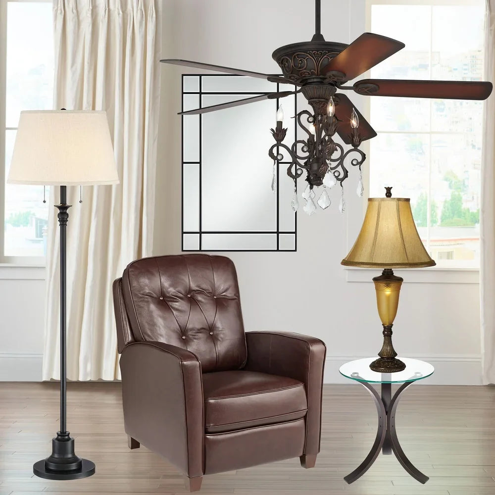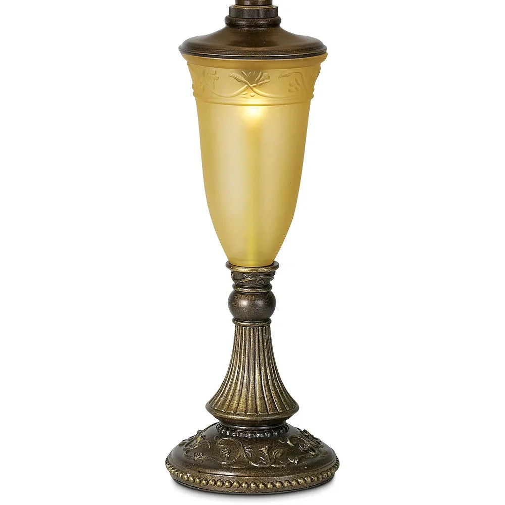 From the Kathy Ireland brand of lighting, this graceful and versatile lamp offers a warm look for bedrooms, living room lighting and more. It features a vintage, traditional glass vase profile. A night light bulb in the base allows you to use the design to light your way at night, or to provide an accent for seating areas. Base and other accents are in an antique bronze finish. The