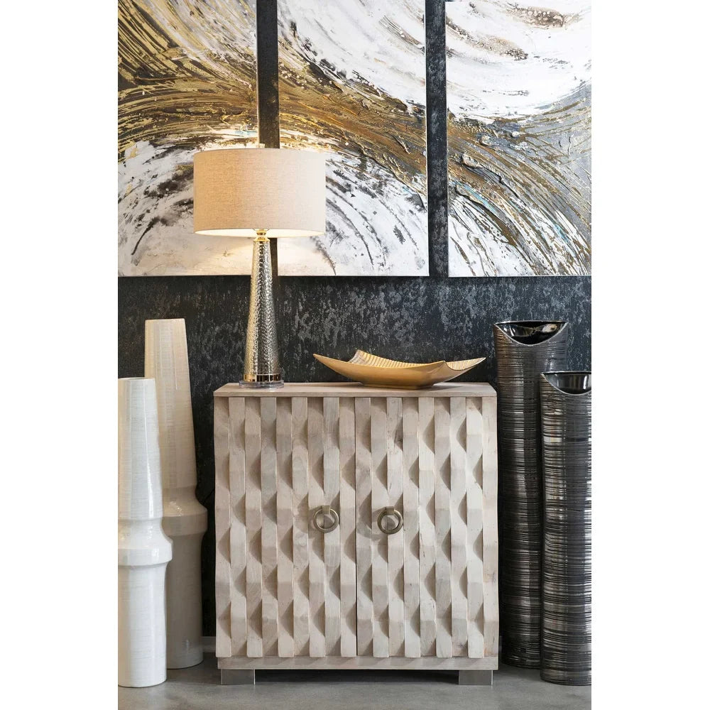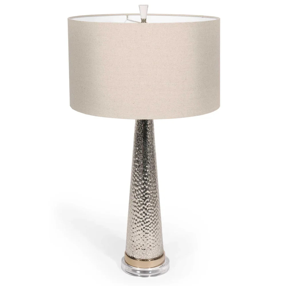 This slender lamp features a textured mercury glass base in a stunning sliver with subtle gold accents and a classic linen shade.