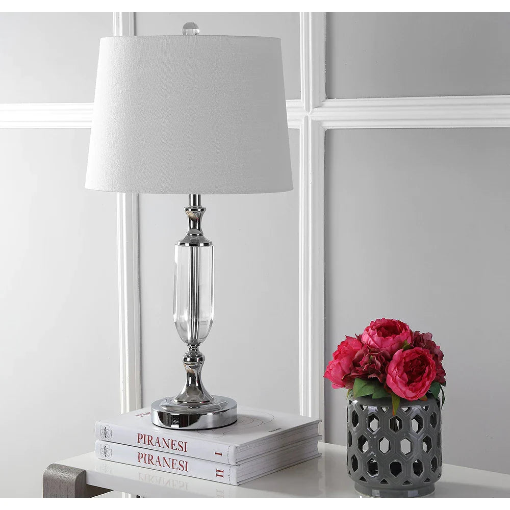 Refresh your decor with this striking crystal table lamp. The modern look features a slightly tapered shade atop a clear fluted-crystal base. A clear winner, this lamp stands out for its finishing touches -- a crystal finial, chrome fittings, and a 60" silk-wrapped cord complete the look.