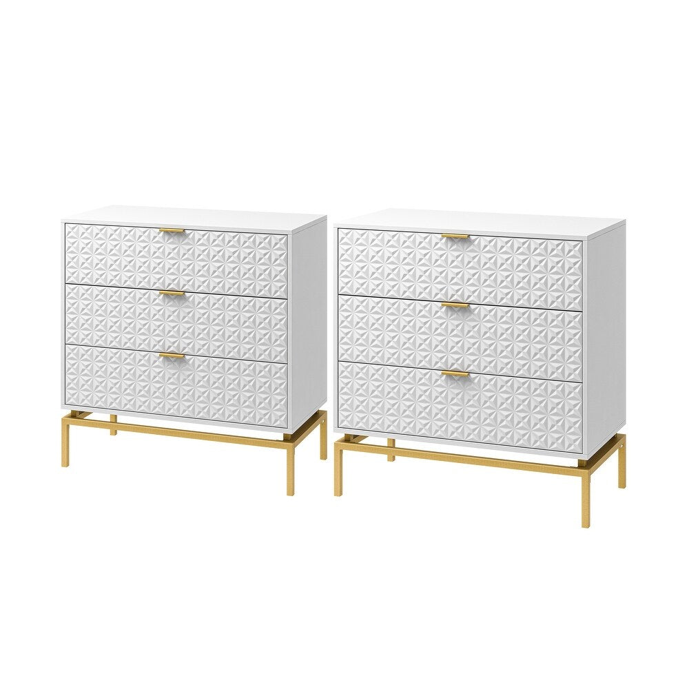 Helping you easily tuck away and organize bedside essentials, this mid-century storage cabinet set is designed for the hallway, living room or storage space. Featuring attractive embossed patterns, 3 drawers equipped with ball-bearing slides and a safety stop mechanism that allows you to pull them out with ease. Supported by a metal base, the modern storage cabinet set uses golden metal legs, which match the golden handles to create a charming appearance. Except for a clean-lined silhouette, it features 3 drawers to access your items with ease and works with other collection pieces to build out your dream home. Behind each drawer, you'll discover ample space for bonus storage. Waterproof, scratch-resistant, and stain-repellent, this wood cabinet set is inclined to recall the pared-down designs of the mid-century and is exquisitely designed for your living spaces.