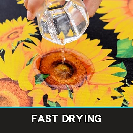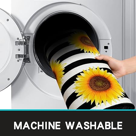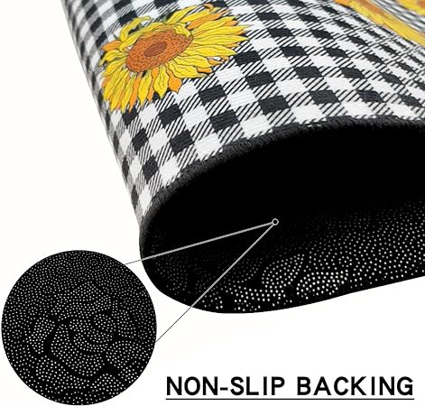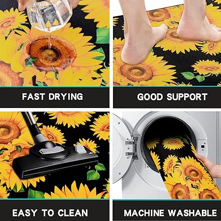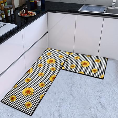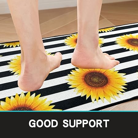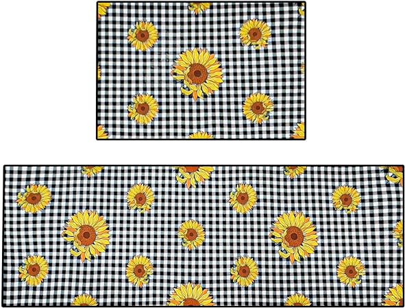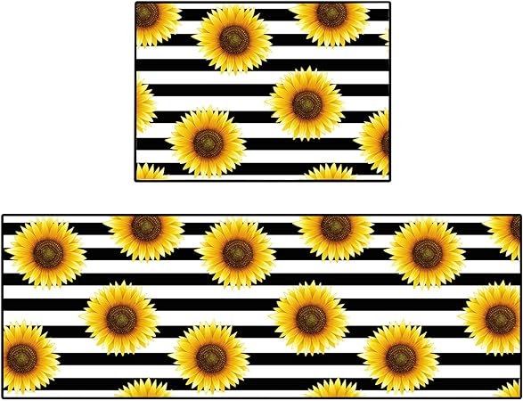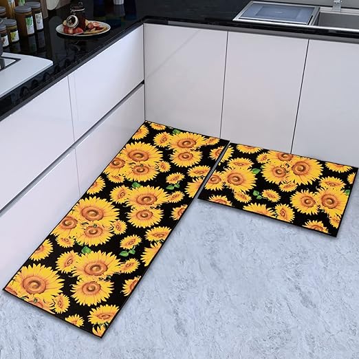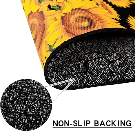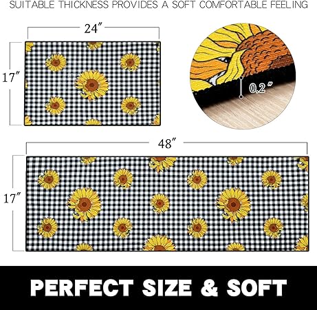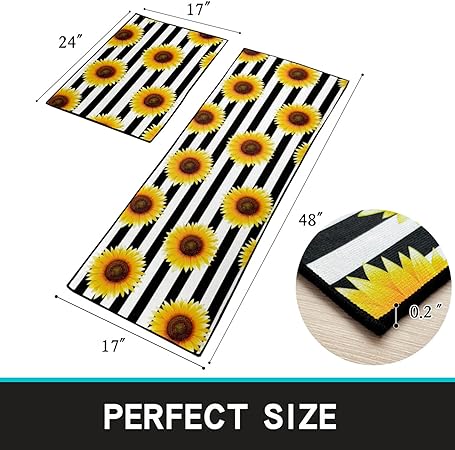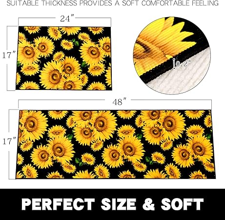 - 【Thicker Mat】The sunflower kitchen mat set is made of 0.2 inch thick microfiber for better support and comfort when standing on them. Measured as 17*24+17*48 inches. Suitable for kitchen, living room, office, bathroom, laundry room and so on. The surface fabric is soft, comfy, Durability. The non-slip backing is already attached saving you the hassle of cutting and buying your own!
