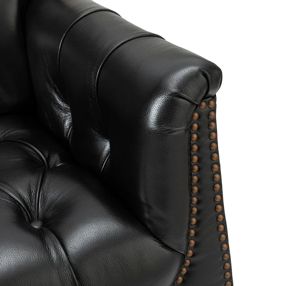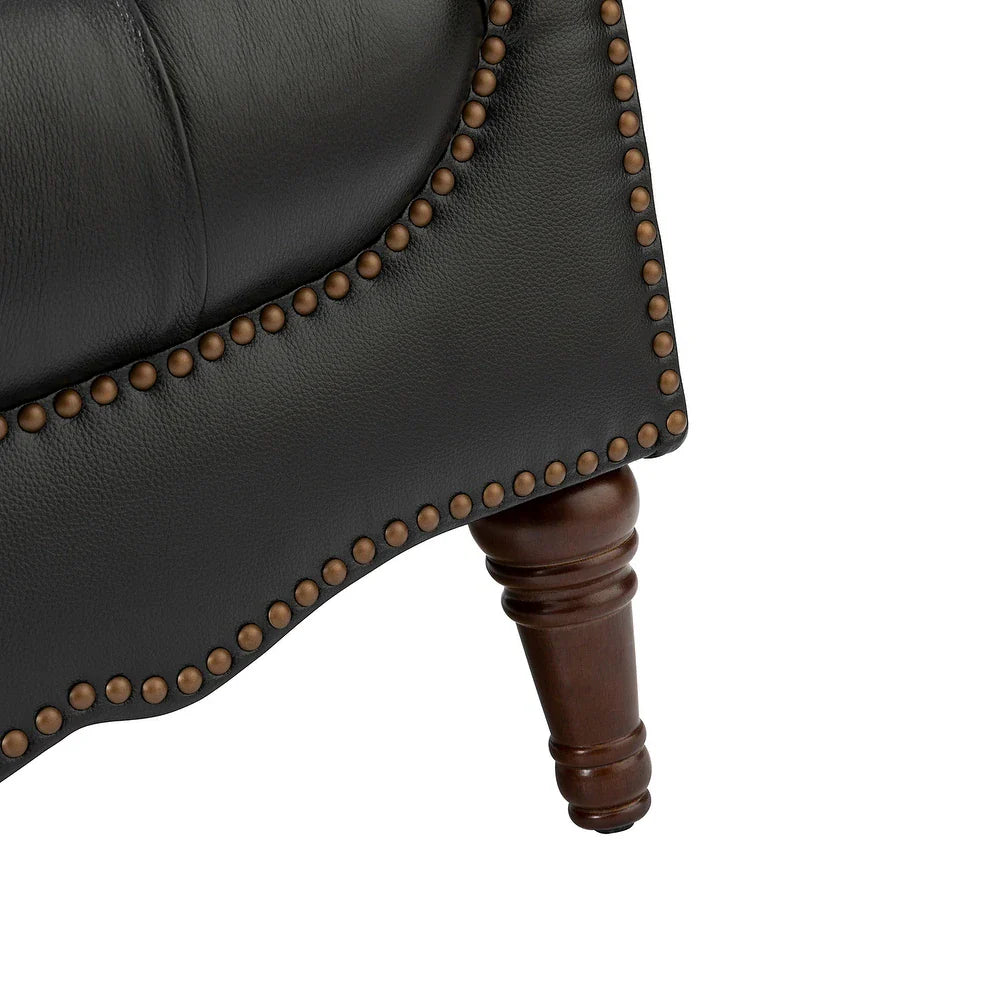 This armchair set creates an important place to sit and enjoy a good book or catch up on your favorite show. Made with a solid and manufactured wood frame, it features brown-turned legs, dependable arms, and a tufted backrest, creating a silhouette that transitions from traditional elements to a modern design. The top-layer cowhide interior is paired with a thick foam-filled seat cushion and has a spring seat structure that provides just the right amount of rebound support. The high-end and classic design of the nail head trim adds a decorative touch to the armchair. Sit in this armchair set in front of a warm fireplace or an elegant study for super comfort and enjoyment.