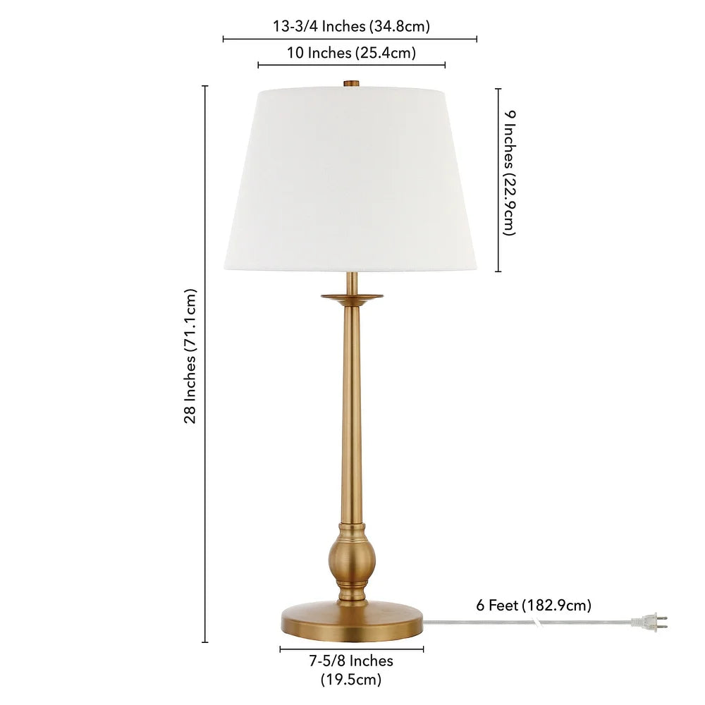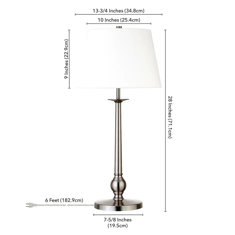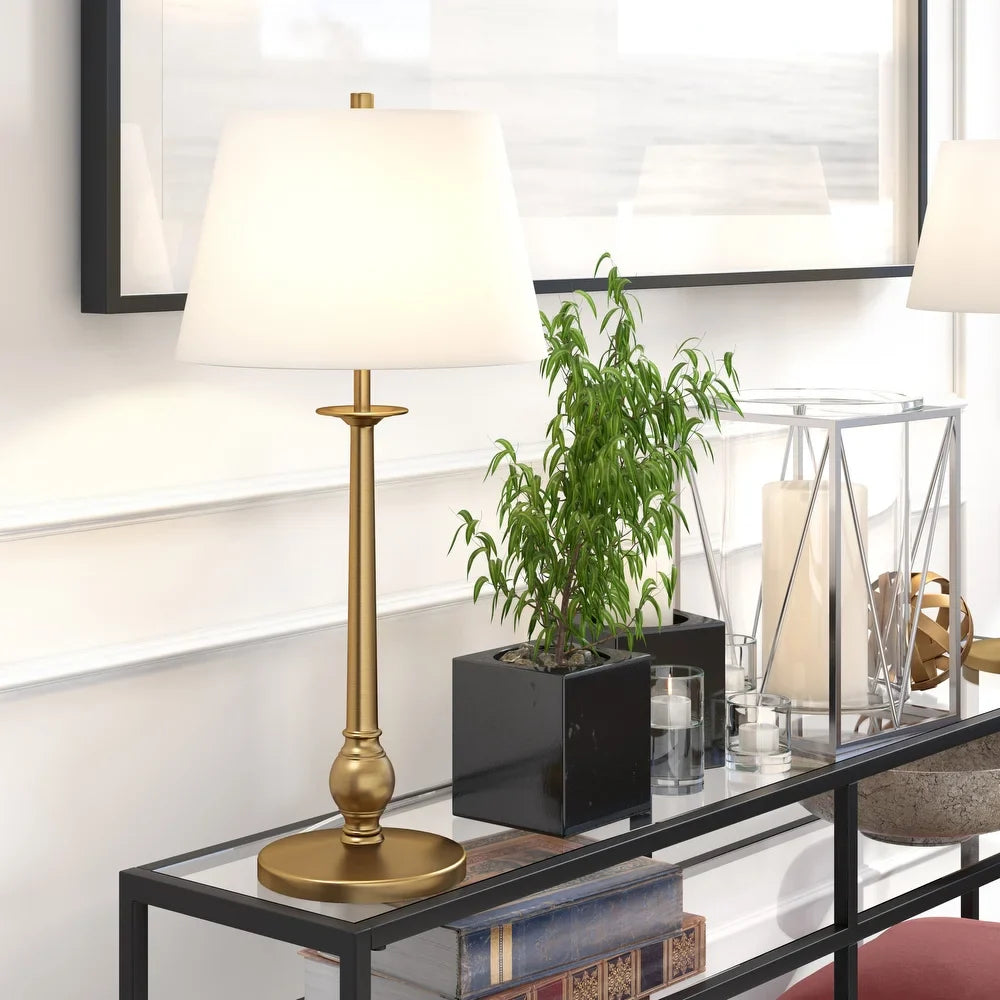 Cast a warm glow over your living room or bedroom with this traditional table lamp. Crafted from metal and finished in classic neutral tones, this lamp features a round base and a tapered fabric drum shade. Capture a cozy, modern farmhouse vibe in your living room, or pair them at your bedside for a classic look.