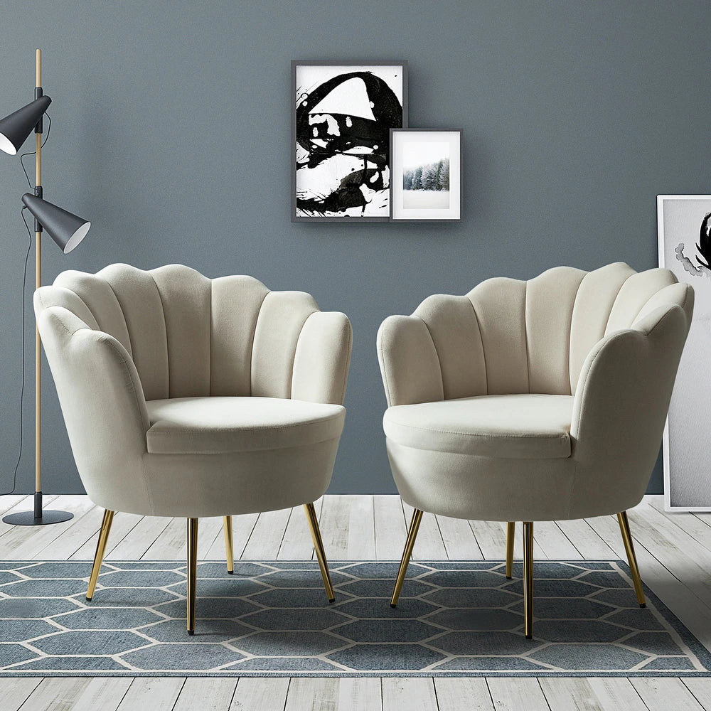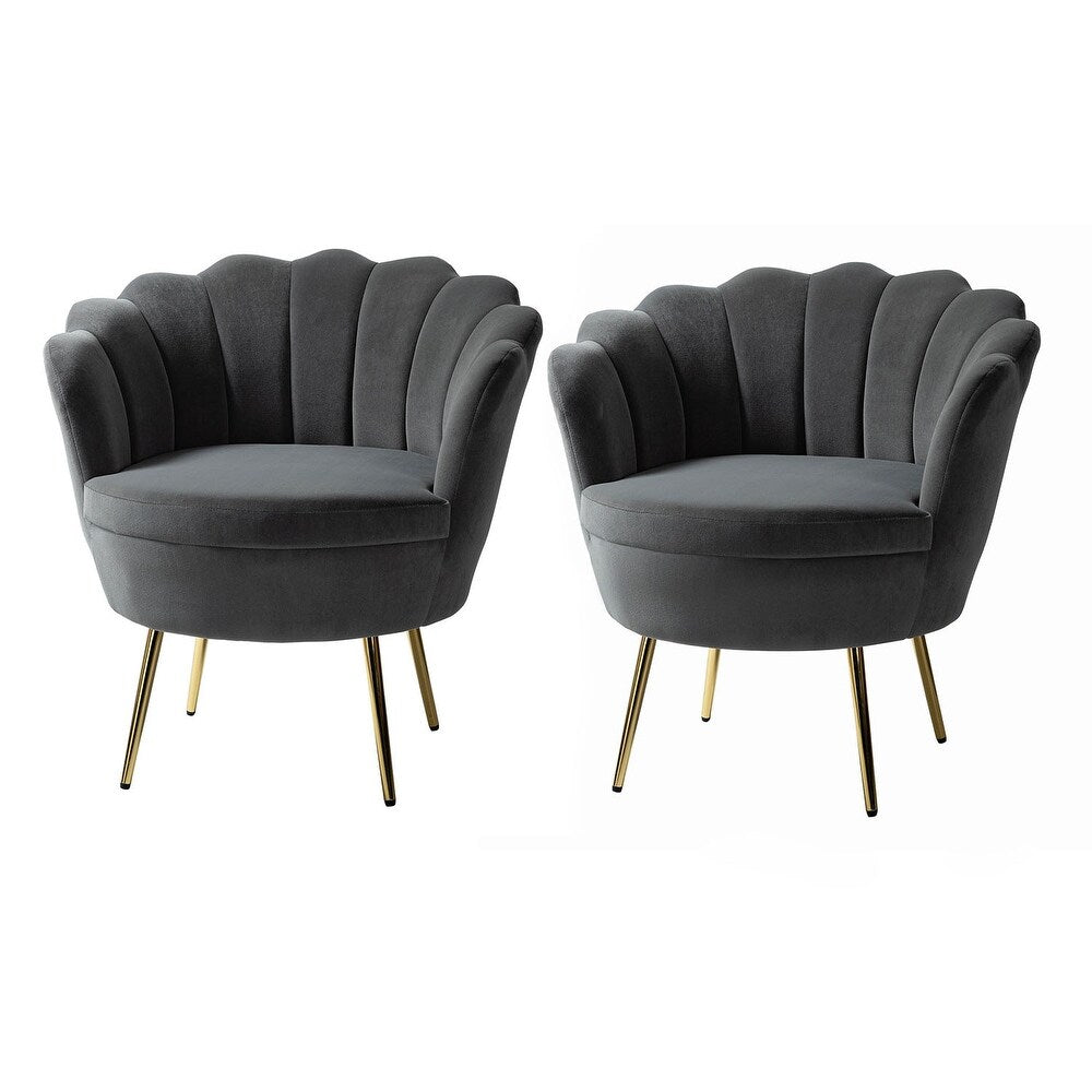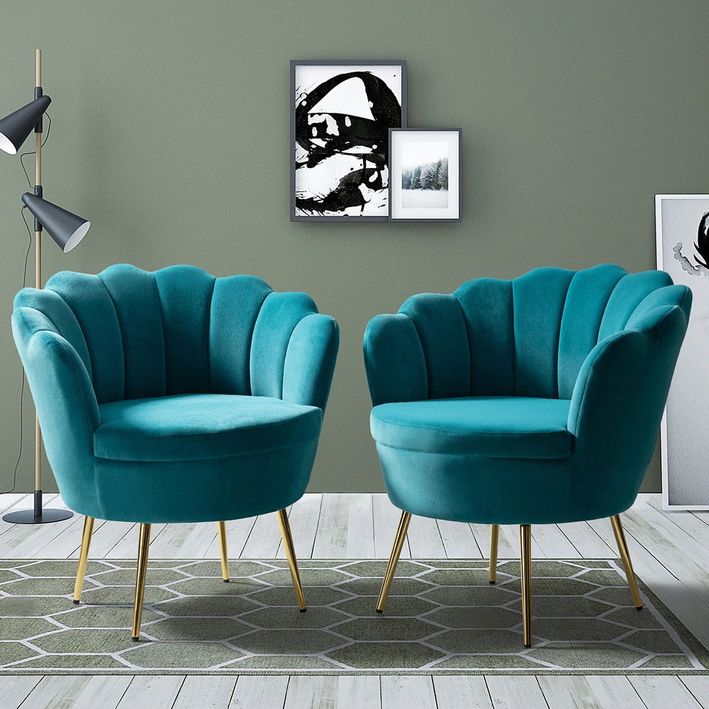 Upgrade your living room decor with our Gaitana Cute Velvet Upholstered Comfy Barrel Chair. The premium velvet fabric in a solid hue seamlessly blends with any color scheme, while the vertical channel tufting on the back adds charming detail. This classic and contemporary barrel chair is made with a sturdy solid and manufactured wood frame, filled with high-density foam for exceptional comfort and support. The slender golden metal legs provide a modern touch, while the scalloped seashell edges give a touch of elegance to this timeless piece. Whether you're looking to create a conversation area or a cohesive seating arrangement, this set of two chairs is ideal for any space including living rooms, offices, bedrooms, and more.
