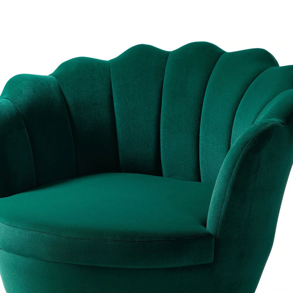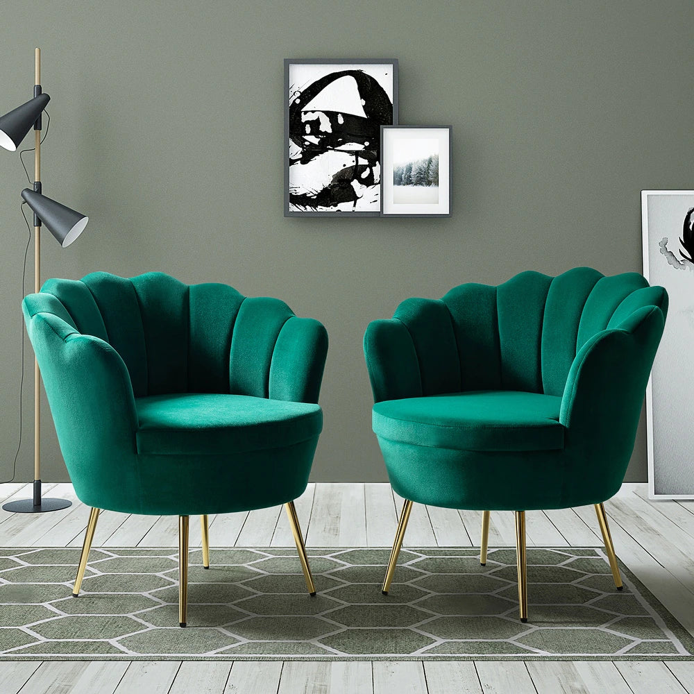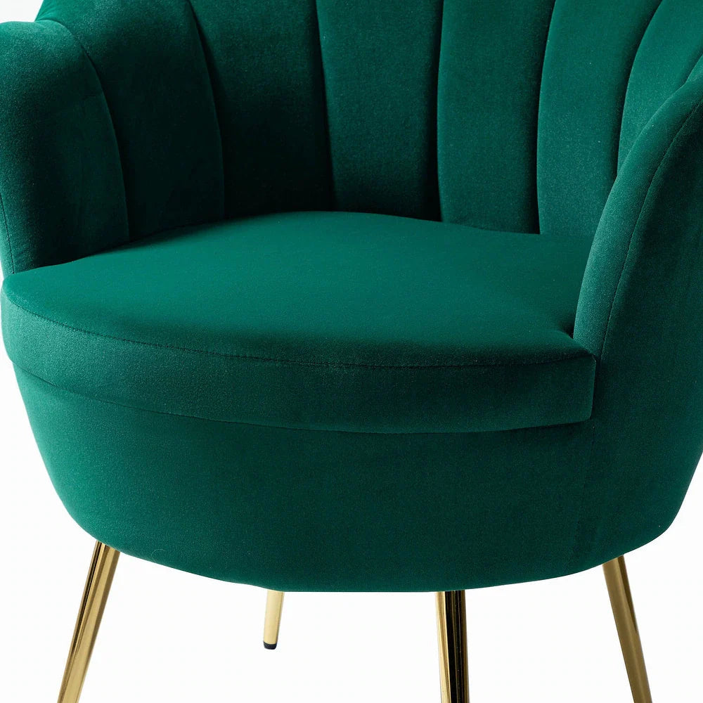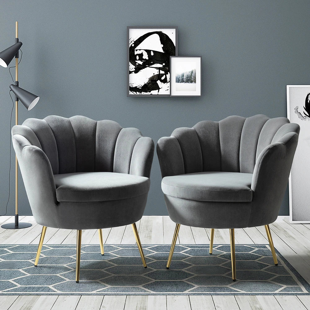 Upgrade your living room decor with our Gaitana Cute Velvet Upholstered Comfy Barrel Chair. The premium velvet fabric in a solid hue seamlessly blends with any color scheme, while the vertical channel tufting on the back adds charming detail. This classic and contemporary barrel chair is made with a sturdy solid and manufactured wood frame, filled with high-density foam for exceptional comfort and support. The slender golden metal legs provide a modern touch, while the scalloped seashell edges give a touch of elegance to this timeless piece. Whether you're looking to create a conversation area or a cohesive seating arrangement, this set of two chairs is ideal for any space including living rooms, offices, bedrooms, and more.