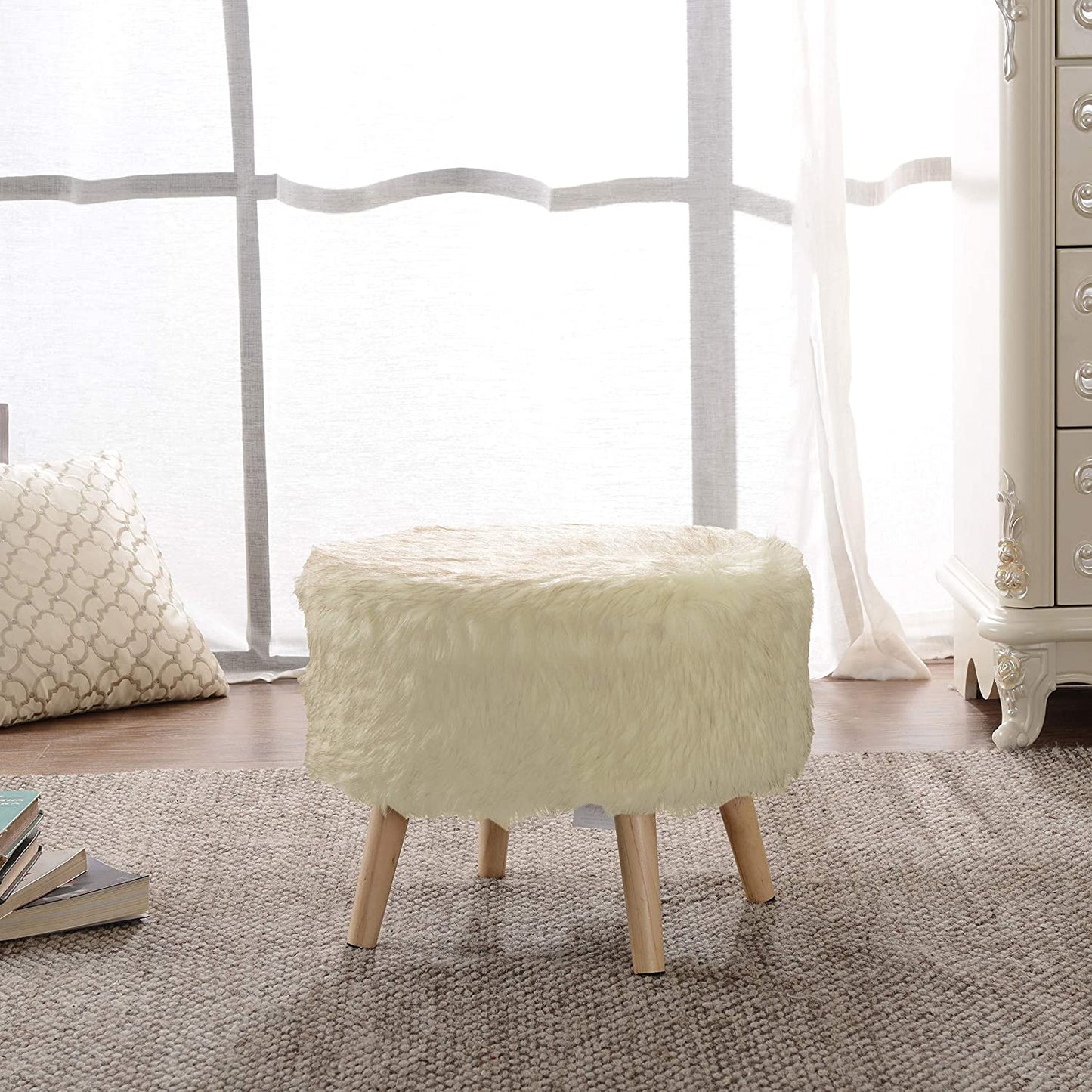 - Elegant - Upholstered in attractive white faux fur and a practical size for a great addition to any room or interior design