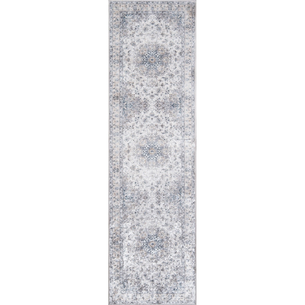 Add an elegant finishing touch to your formal parlor with this classic Oriental area rug. Crafted in elegant shades of grey with a crisply delineated tracery pattern, this beautiful polyester medallion rug comes in several sizes to suit your needs, and the low pile won't block doors or cabinets.